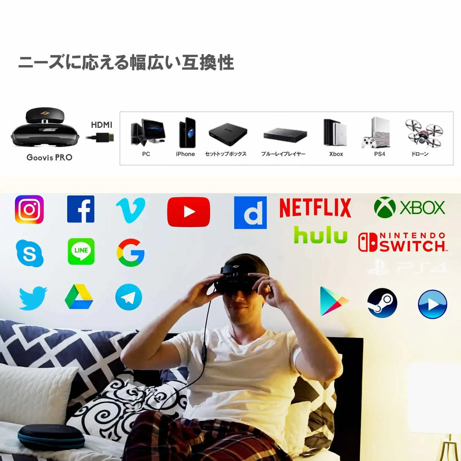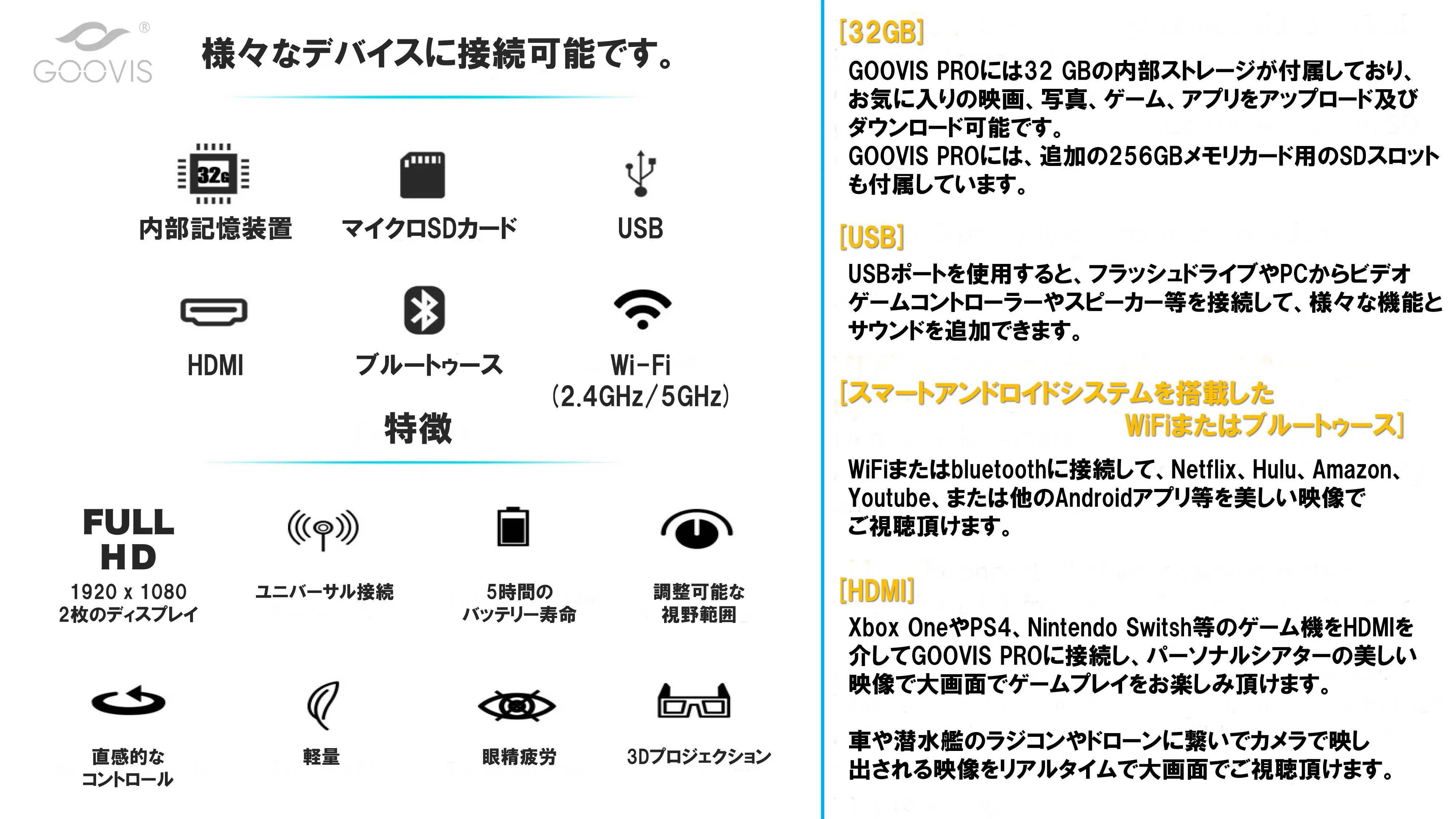 GOOVIS PROには32 GBの内部ストレージが付属しており、お気に入りの映画、写真、ゲーム、アプリをアップロードおよびダウンロード出来ます。