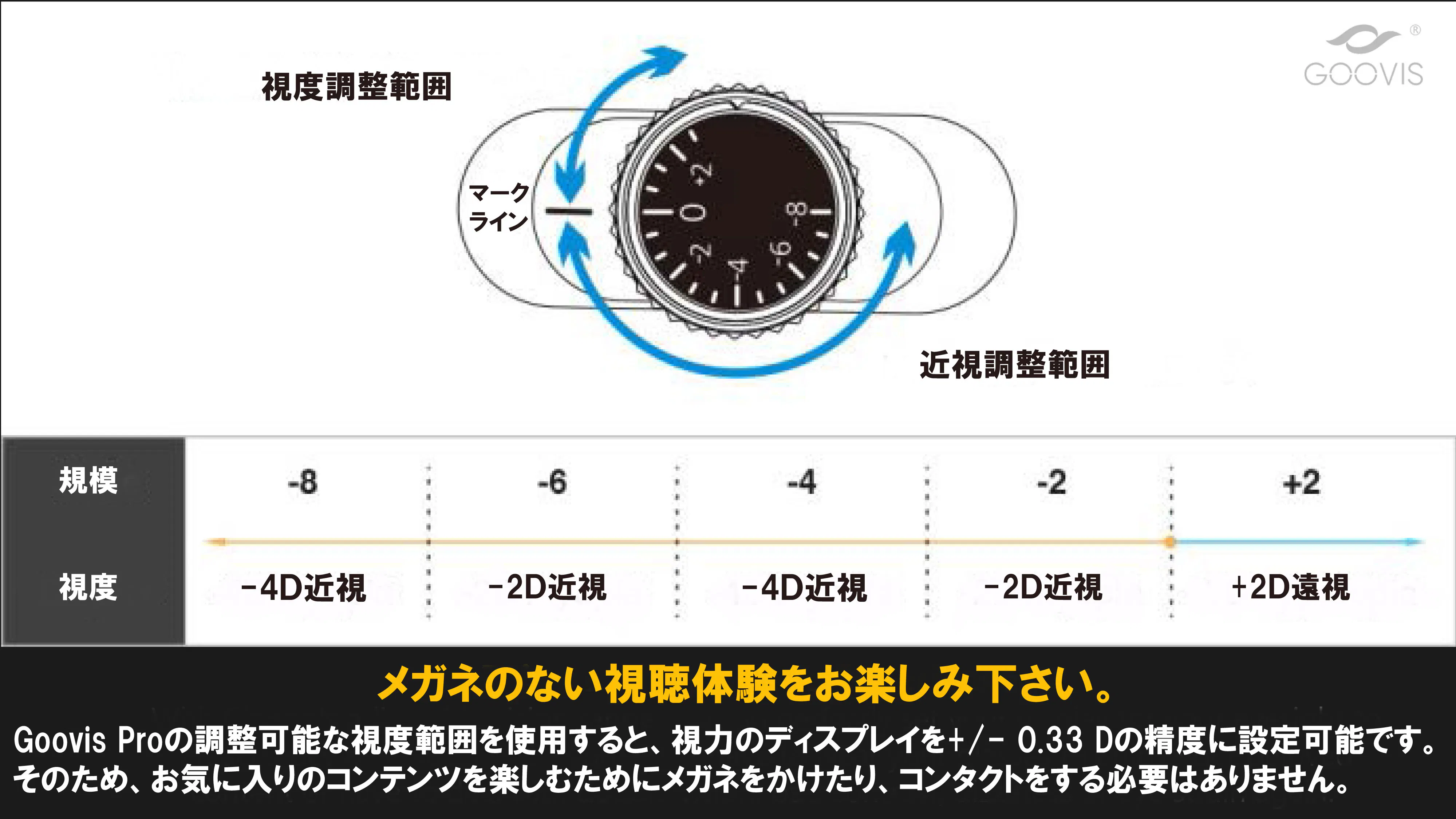 視力が悪くても、このGOOVIS PROであればメガネやコンタクトがなくても視度調整をしてクリアーな映像を裸眼でお楽しみ頂けます。