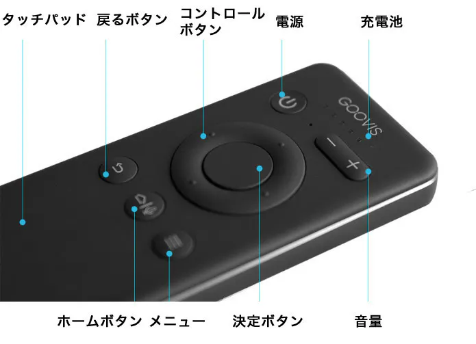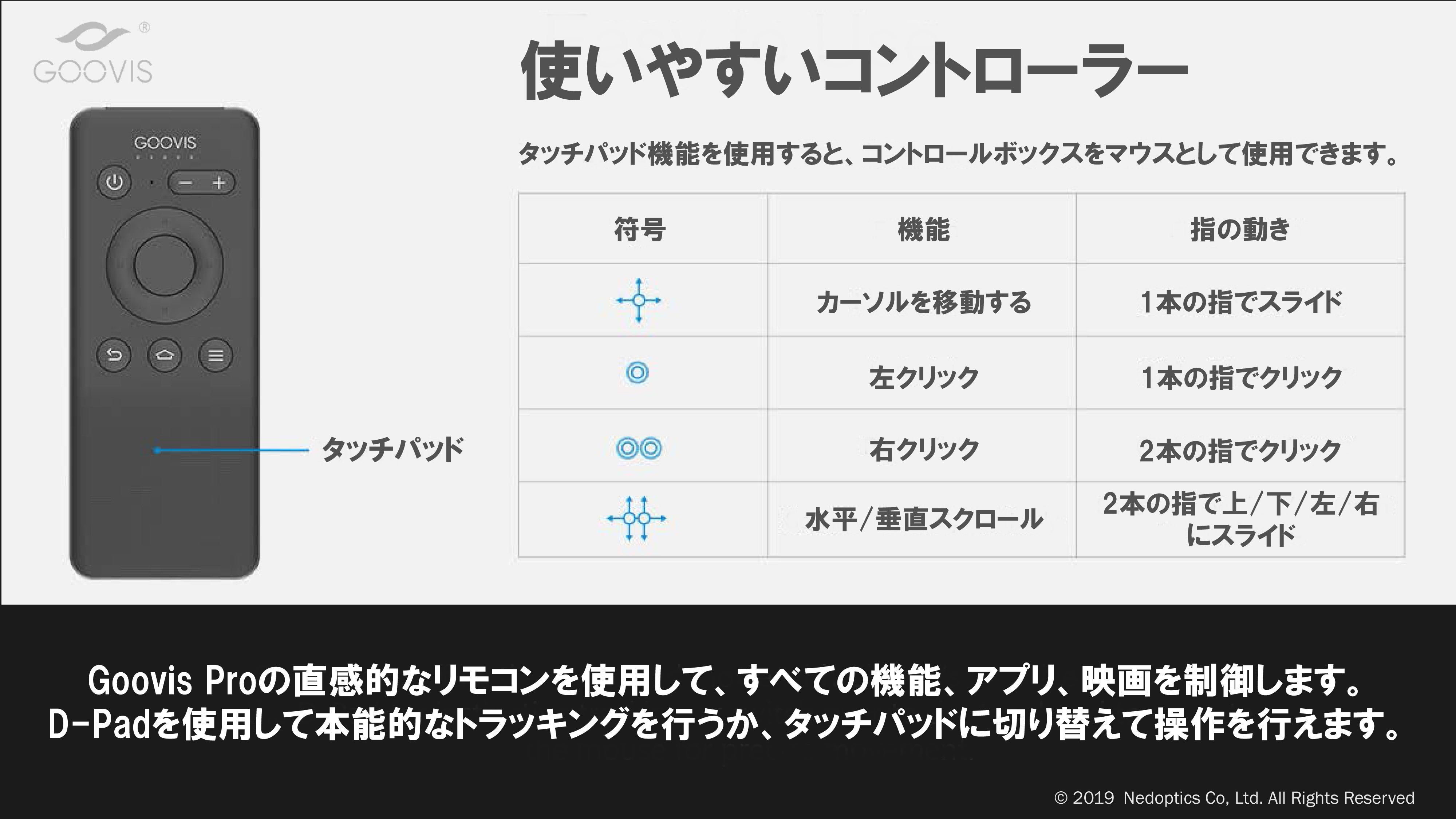 GOOVIS PROは直感的なリモコンで、すべての機能、アプリ、映画などをコントロールします。 タッチパッドやDパッドで簡単にご使用頂けます。