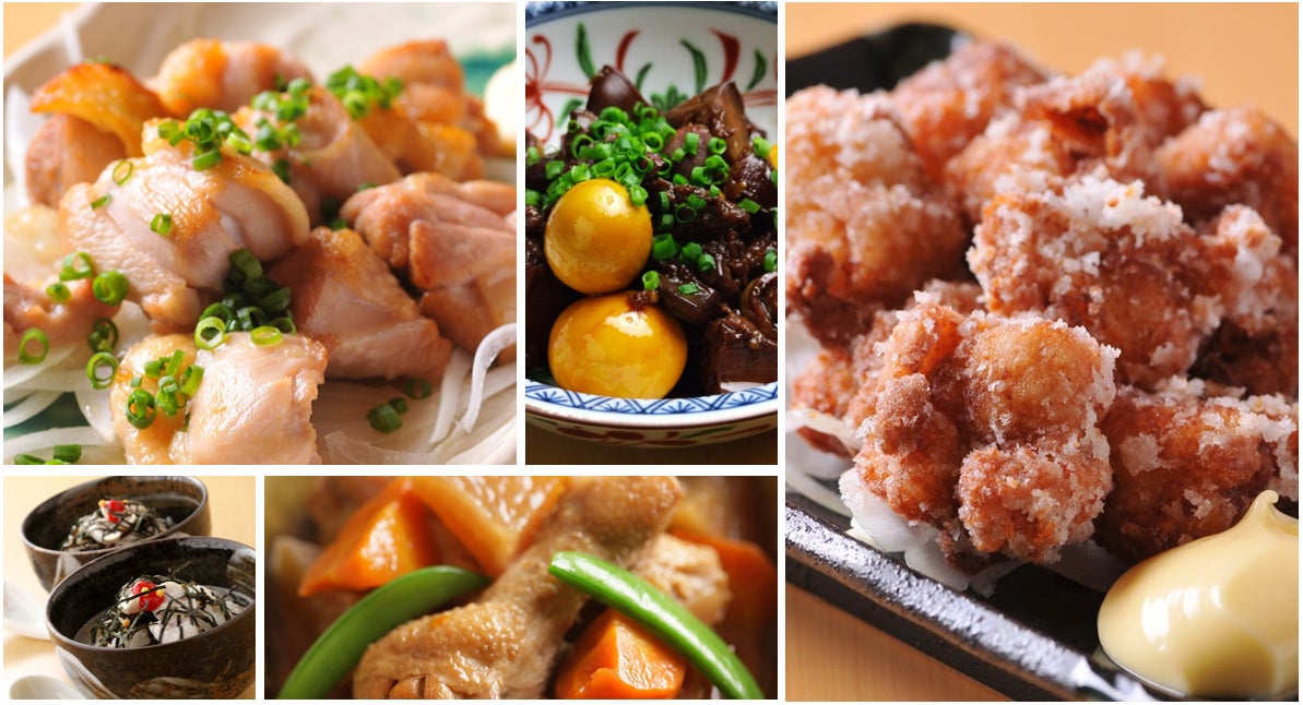 左上から時計回りにもも焼き、鶏もつ煮込み、さくさく鶏のから揚げ、手羽元のこっくり煮、鶏飯