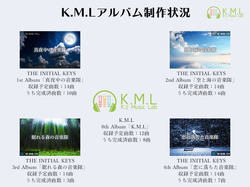 現在、K.M.L名義で1枚のアルバム、THE INITIAL KEYS名義で4枚のアルバムを製作中です。