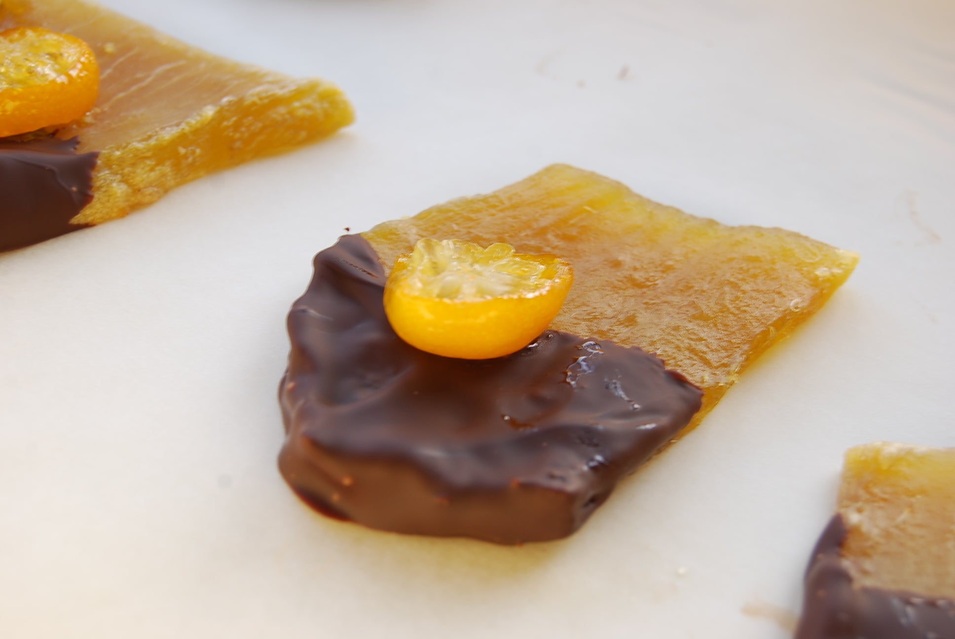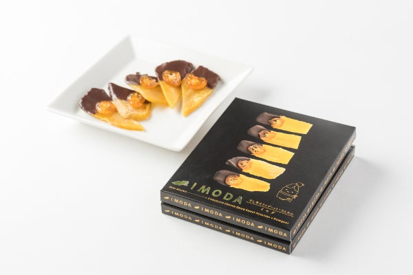 干し芋が陳列されている売り場は何となく暗い、美味しいのに、身体にとても優しいのに、もっと晴れやかな売り方があればいいなと思ったのがきっかけでした。干し芋を宝石に変えるにはどうしたらよいか?試作食を1年繰り返し行った結果勅レートのドレスを着せて金柑のブローチを付けて華々しくデビュー。