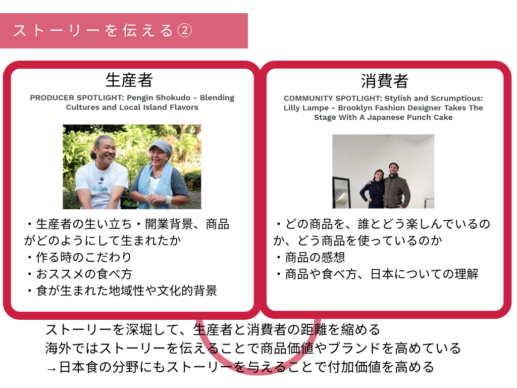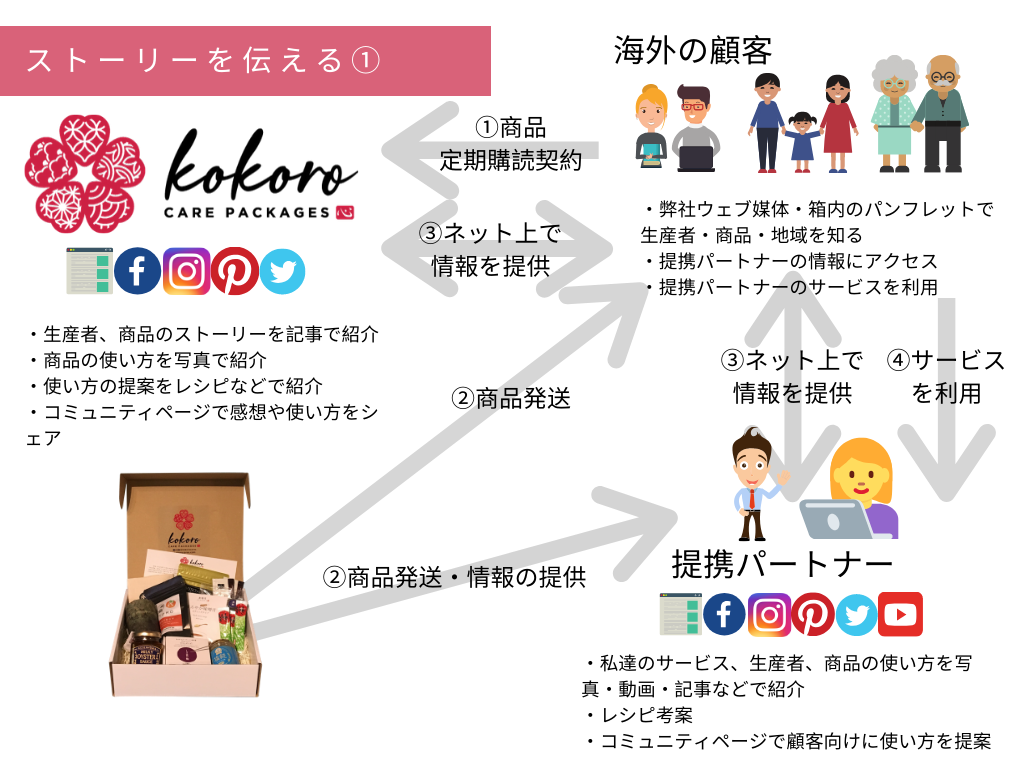 日本の食品を発送し、作り手の想い・食哲学などのストーリーの深堀を加えることで、生産者と海外の消費者がより近い関係を持つコミュニティを作ります。
