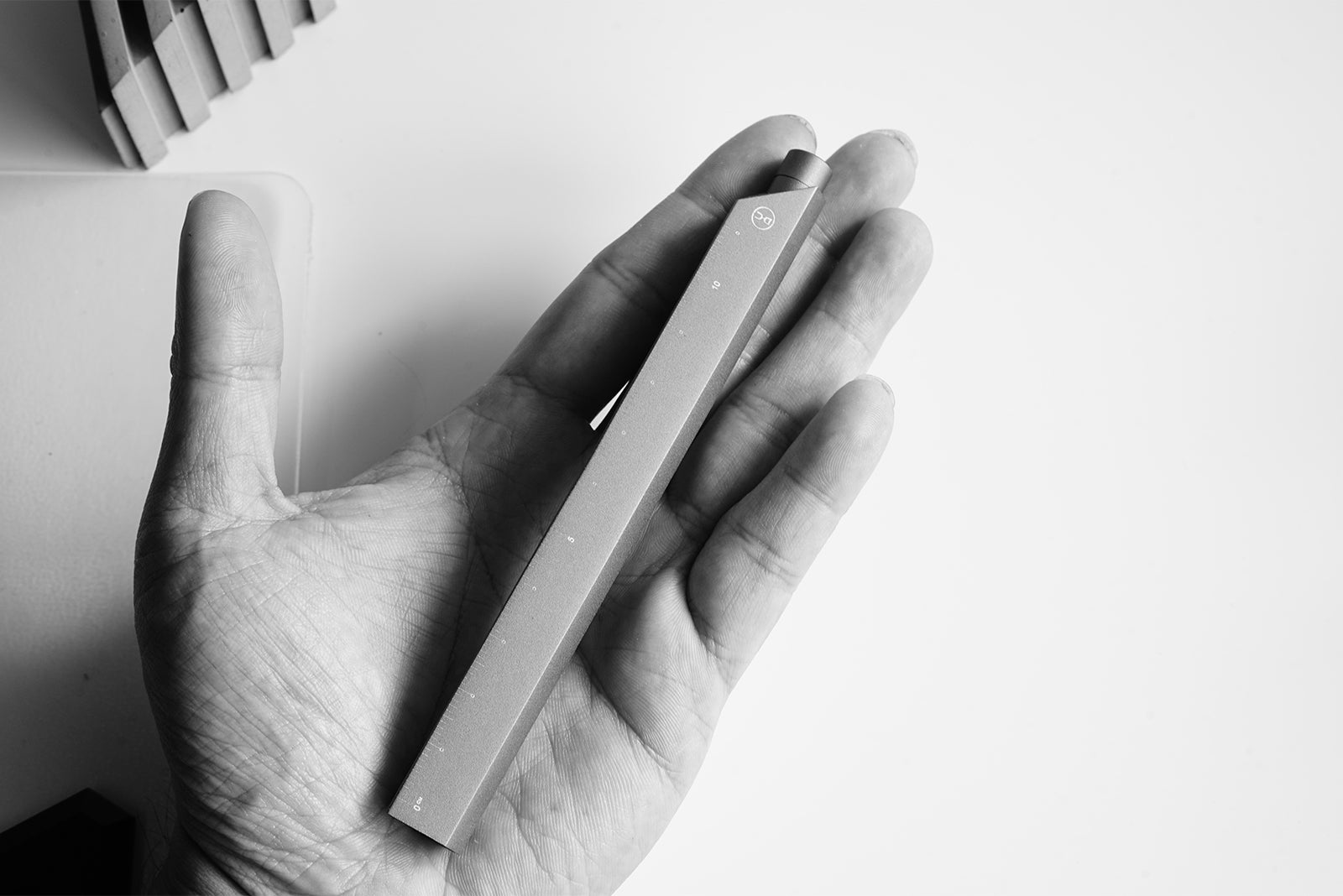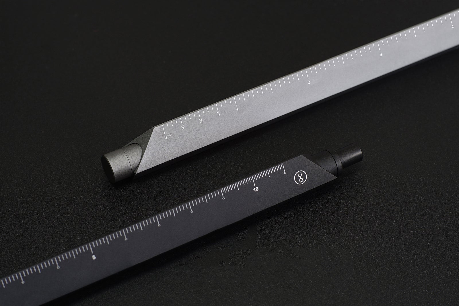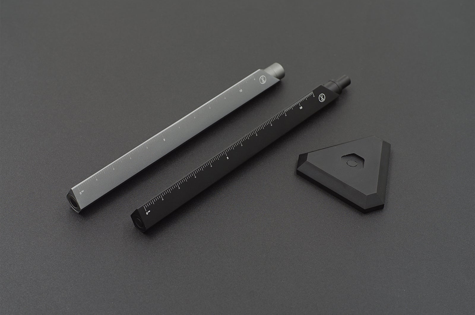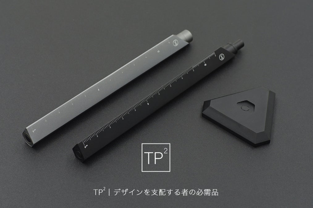 TP²は、高強度、軽量、耐食性に優れた金属である「6061アルミニウム」のブロックからできています。表面にはマットブラックとグレーのアルマイト処理が施されており、ライトグレーのコントラストで、レーザー彫刻の目盛りが施されています。濃い色のスケッチツールにしたことにより、白い紙の上でよりシャープに作業が行えます。
