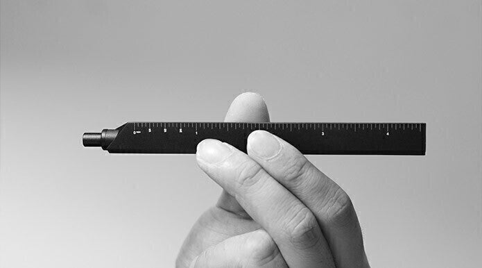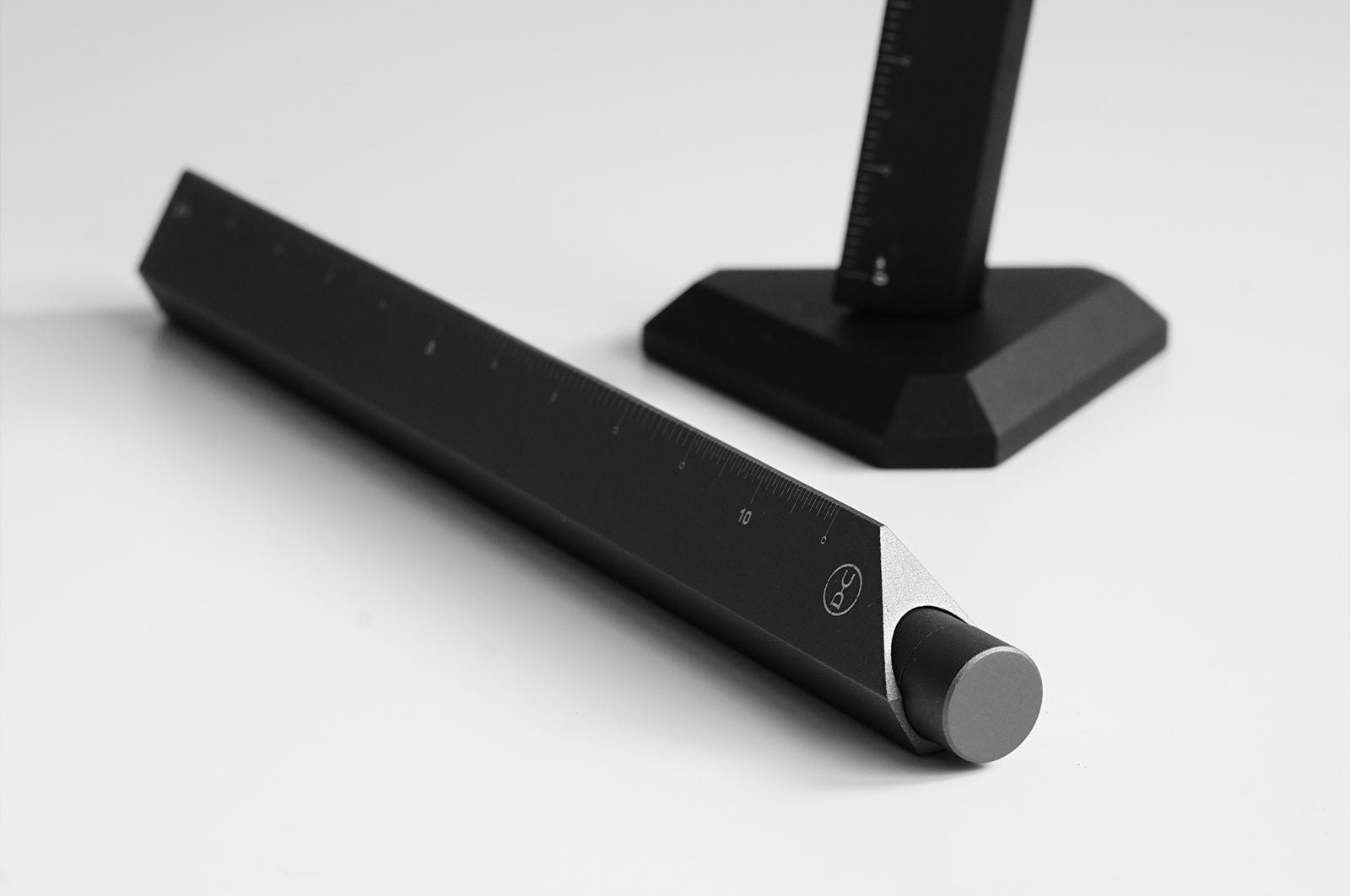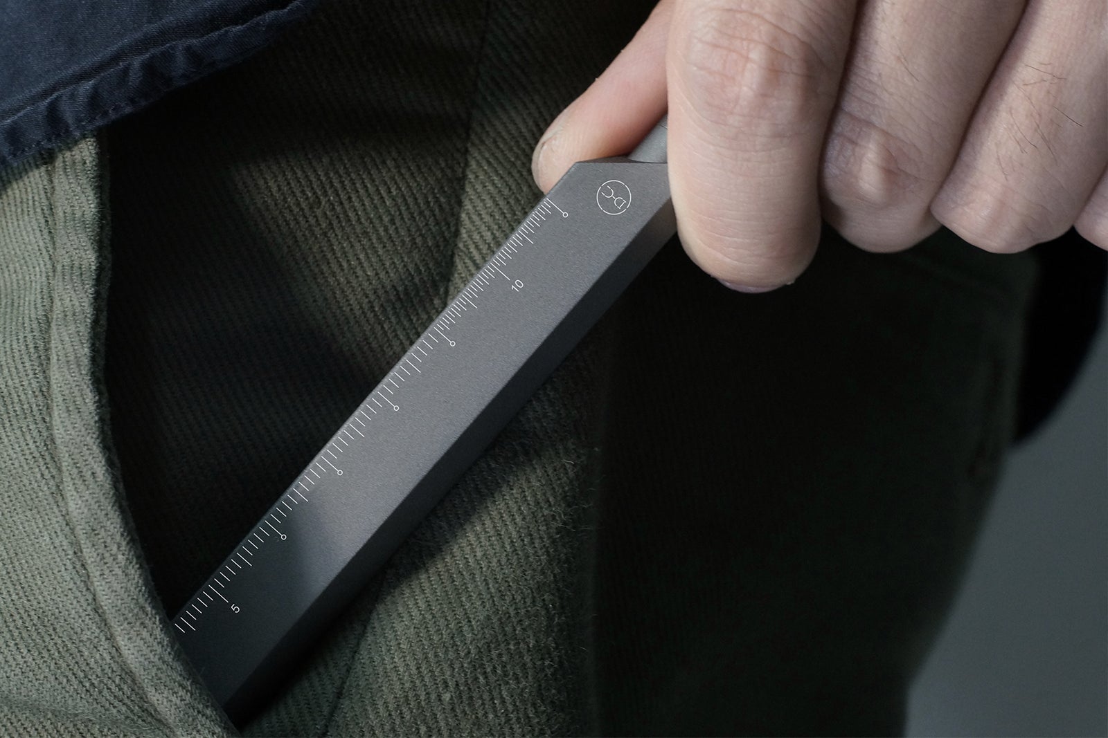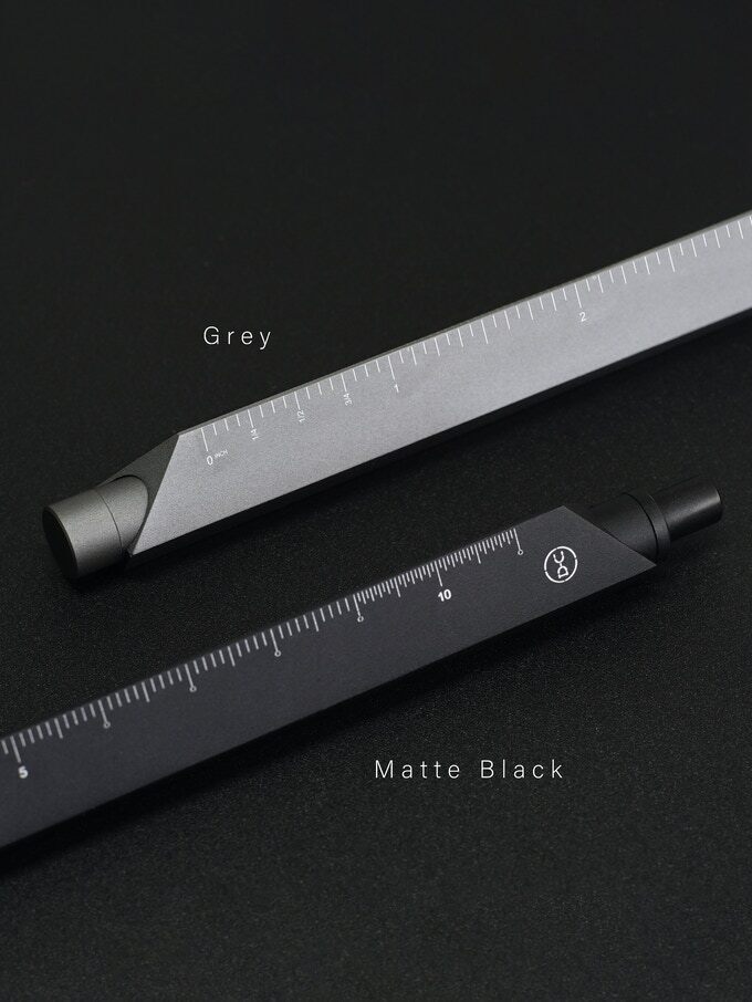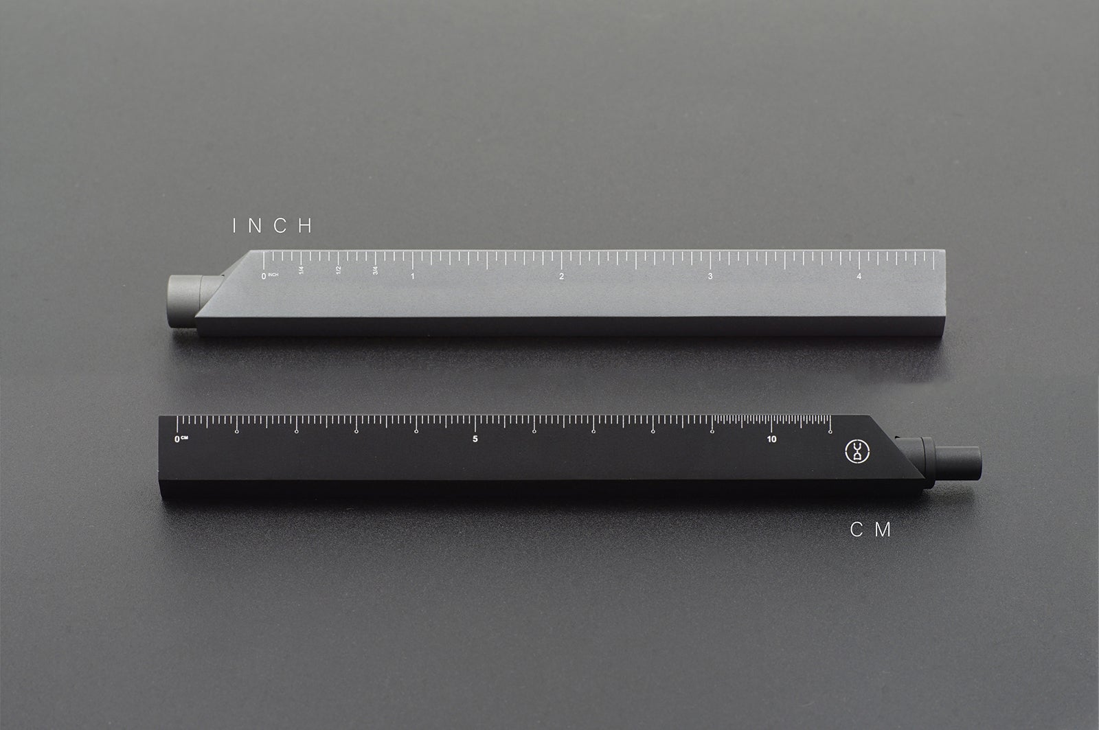 TP²は、高強度、軽量、耐食性に優れた金属である「6061アルミニウム」のブロックからできています。表面にはマットブラックとグレーのアルマイト処理が施されており、ライトグレーのコントラストで、レーザー彫刻の目盛りが施されています。濃い色のスケッチツールにしたことにより、白い紙の上でよりシャープに作業が行えます。