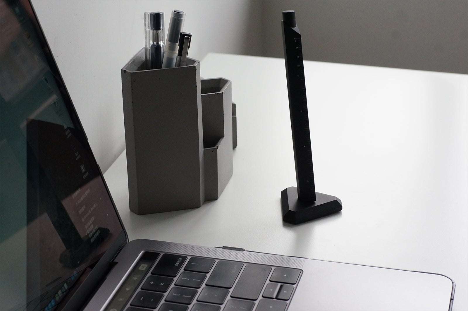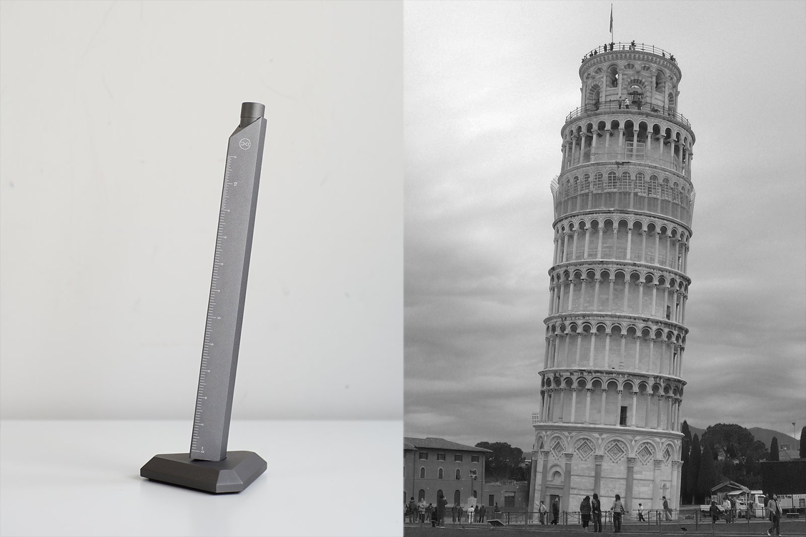 TP²をペン立ての上に置くと、わずかな10°に傾いて浮いたような錯覚とアンバランスな空間を体験可能です。このアイデアは、4°近く傾いていることで世界的に知られるピサの斜塔に由来しています。TP²は時代を超越した筆記用具なのです。