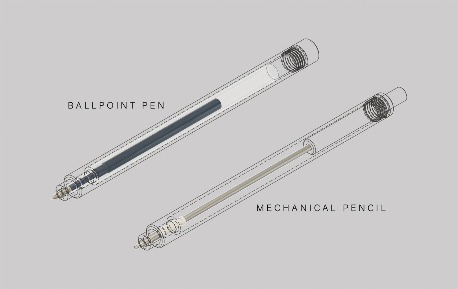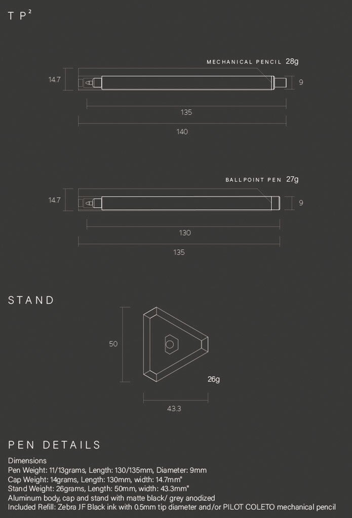 TP²はボールペンとシャープペンの詰め替え対応を可能にした、ユニークなアルミニウム製の筆記用具です。ペンは、メインシャフト、キャップ、ペンスタンド、ボールペンのインク/ペンシルカートリッジの4つの主要コンポーネントで構成されています。