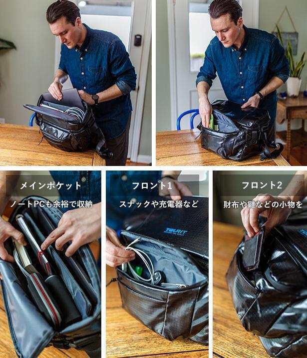 普段の日常使いであれば、15.6インチのノートPCが入り、財布や充電器、家や車のカギもしっかりと分けて収納ができるので、必要なときにすぐに取り出せます。