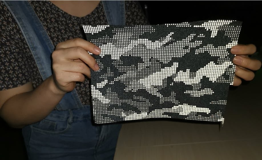 日中は、GRAYですが、夜間に車のライトなど強い光を当てるとカモ柄が浮き上がってくる素材となっています。