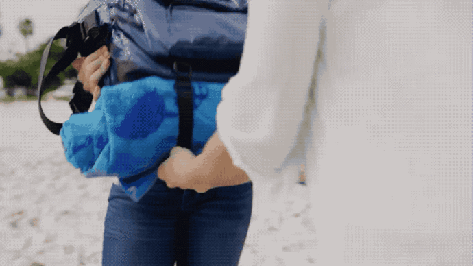 バッグの底には2本のストラップがあり、ブランケット、衣類、タオル、ヨガマットなどを取り付けられます。