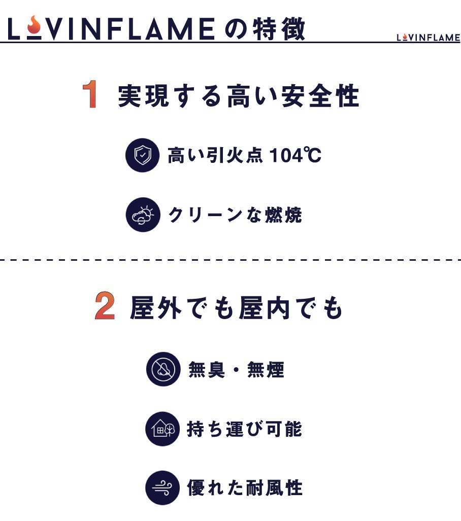 ※安全の為、必ずLovinflame専用燃料をご使用ください。Lovinflameの安全性は本体付属の特許取得済みのステンレス芯と、水溶性で引火点の高い専用燃料を併用いただくことで実現します。