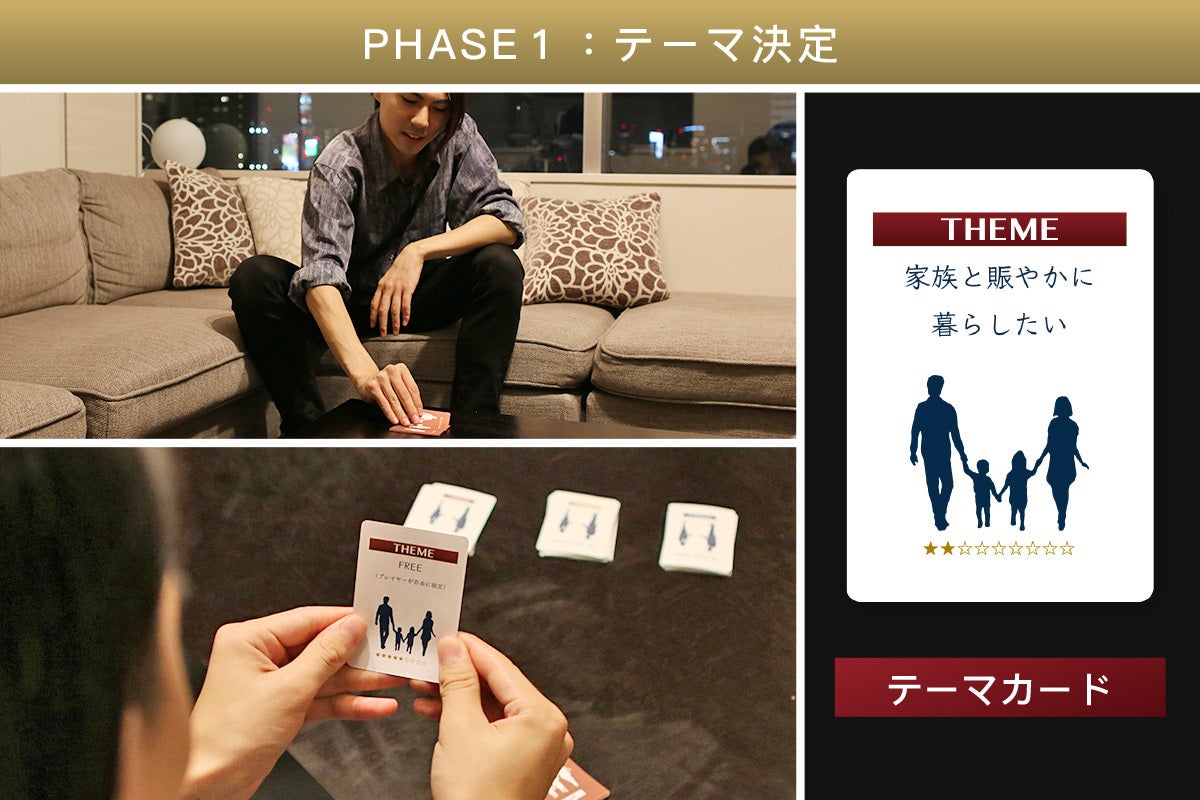 テーマ決定:まず判定員となるお客様役のプレイヤーが「テーマカード」を引き、そのラウンドにおけるテーマが決まります。
