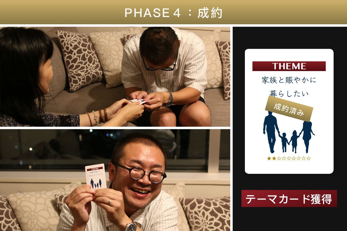 成約:全員のポエムが出揃った後に、お客様役プレイヤーが気に入ったポエムを1つ選びます。選ばれたポエマーは成約の証として当該ラウンドの「テーマカード」を獲得し、ラウンド終了となります。