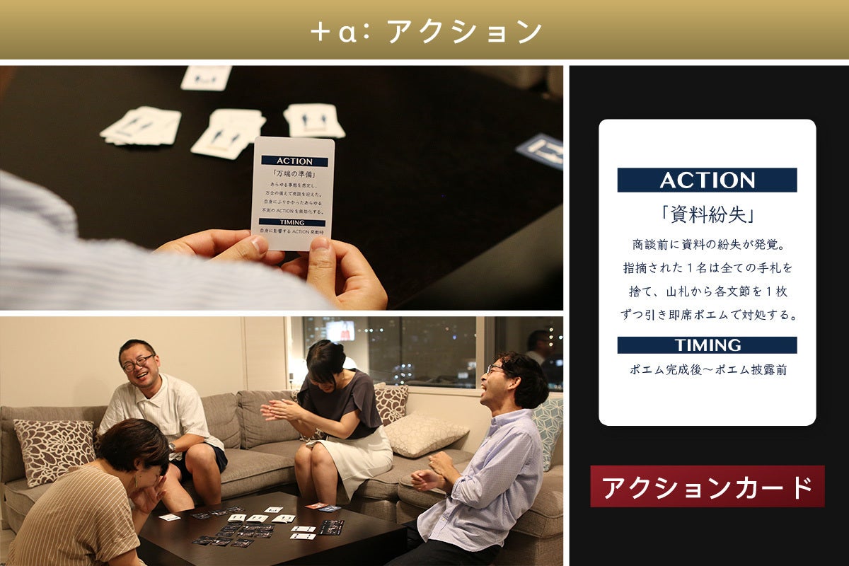 アクション:ゲームを盛り上げる要素として、各ポエマーはポエム生成~プレゼンのフェーズで、状況に変化をもたらす「アクションカード」を使用することができます。このカードを発動するとポエム生成やプレゼン時に何らかのトラブルが生じ、プレイヤーが意図しないポエムや意外性のあるポエムが生み出されるきっかけとなります。