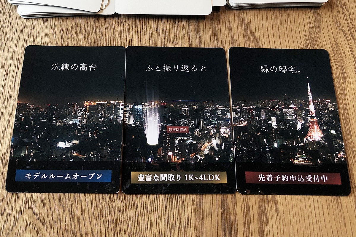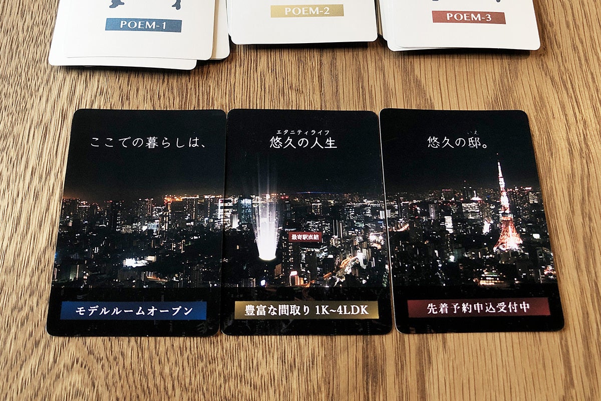 この内「ポエムカード」は、マンションポエムの構成要素を「上の句・中の句・下の句」の3文節に分割してカード化しており、3枚を並べると1つのマンションポエムができあがる仕組みです。