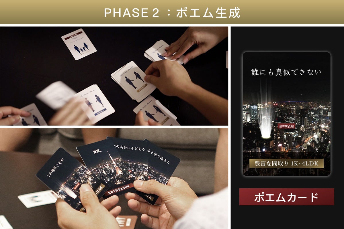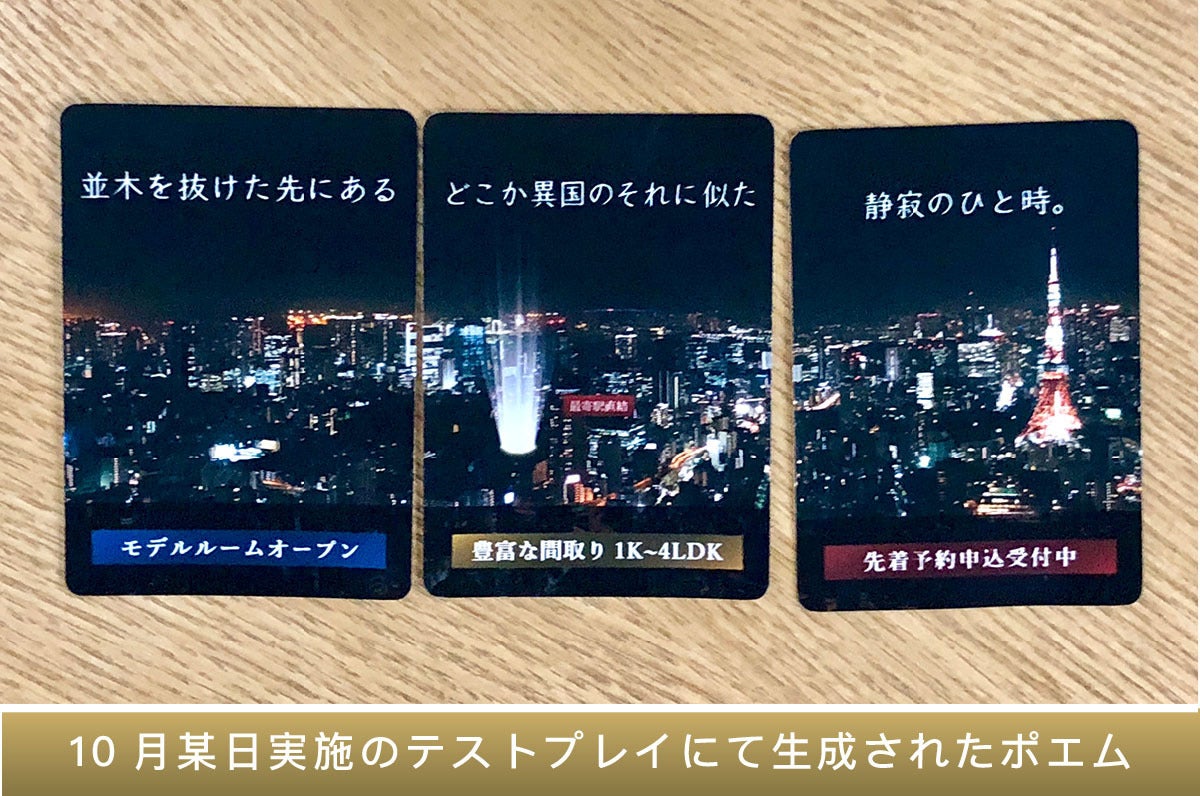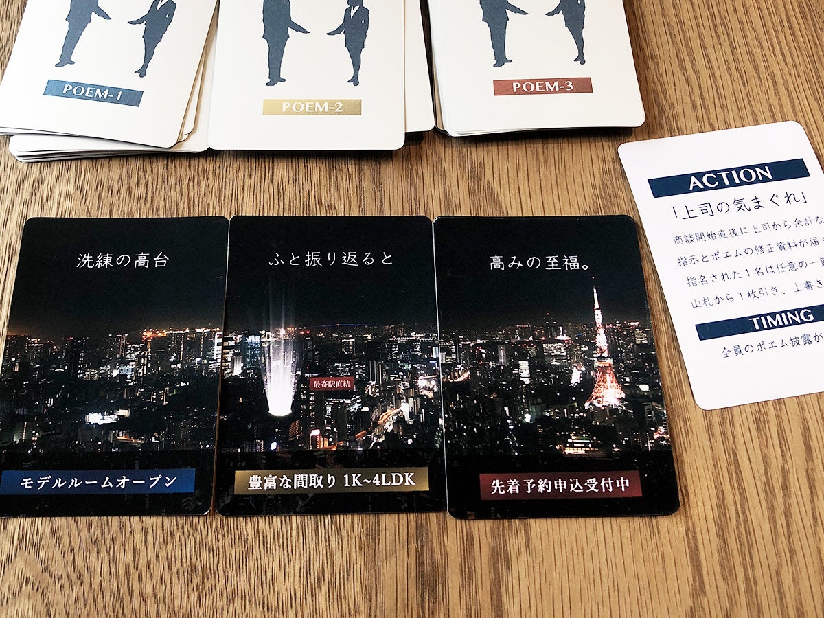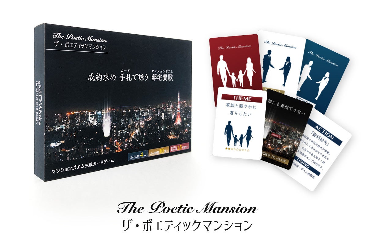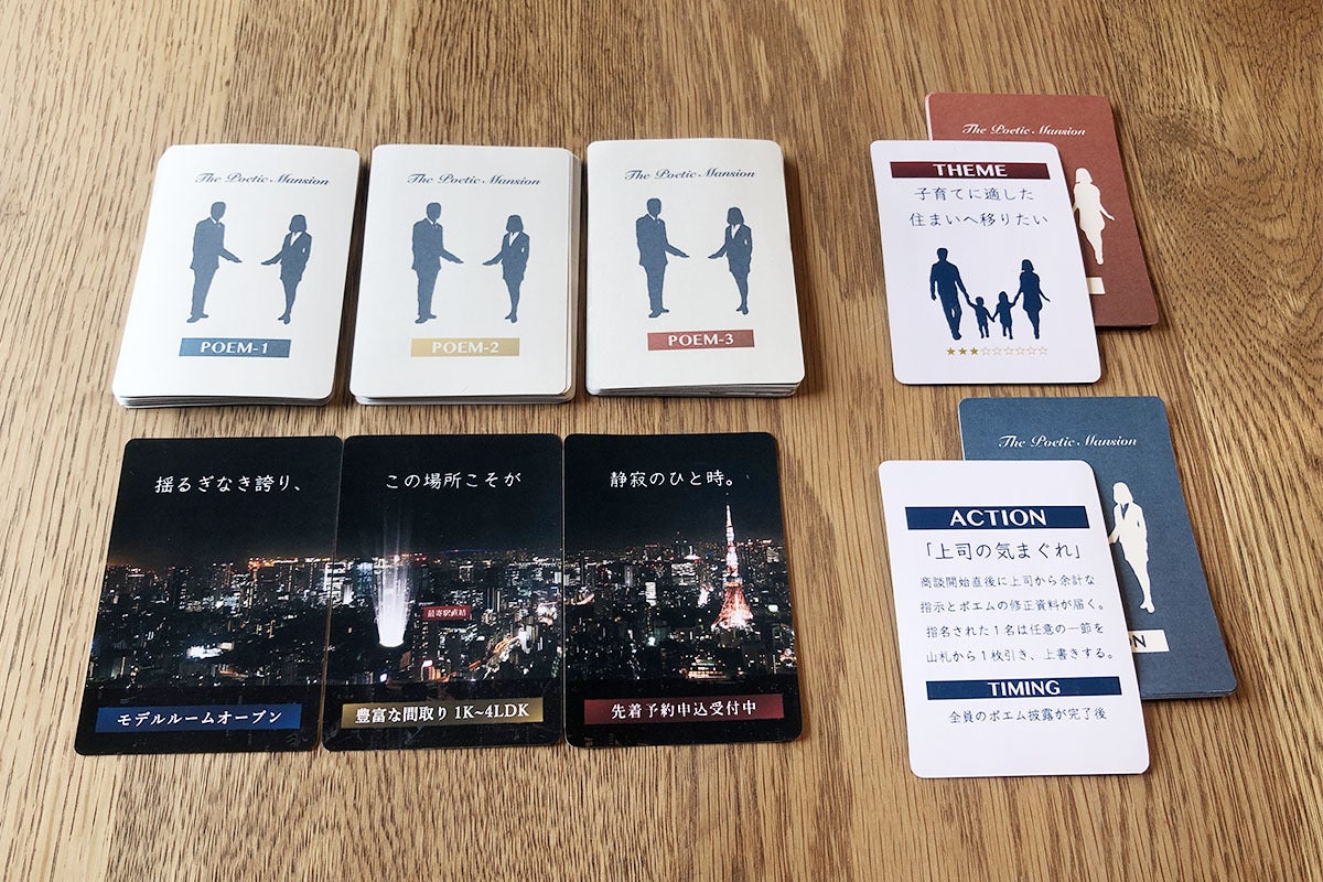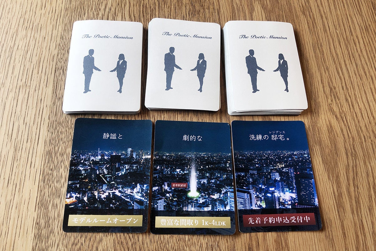 「ザ・ポエティックマンション」は、カードを組み合わせてポエムを生成し、(架空の)マンションをより魅力的に訴求して成約を勝ち取るカードゲームです。