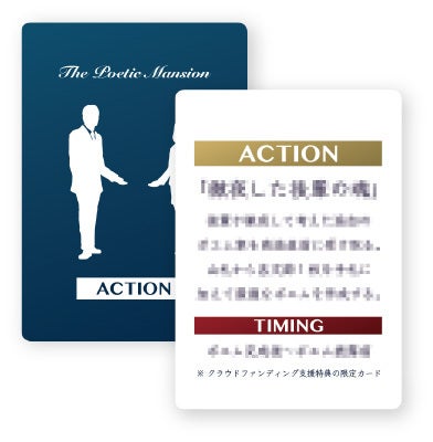 ゲーム内で使用することのできる「アクションカード」のクラウドファンディング限定版を1枚追加致します。このカードを発動するとポエムの生成時にある出来事が起こり⋯(内容は完成品をお楽しみに!)