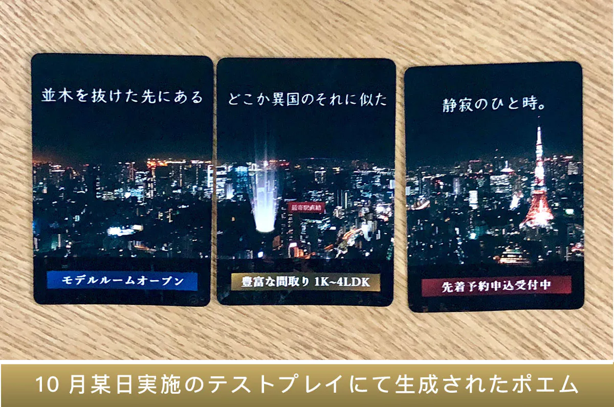 3枚並べると1枚の広告のようになる点と、「光の柱」でマンション広告感を演出した点がアートワークのポイントこの時点では、各文節3枚ずつ(合計9枚)の手札からポエムを作成して披露するシンプルなゲームを想定していました。ところが…