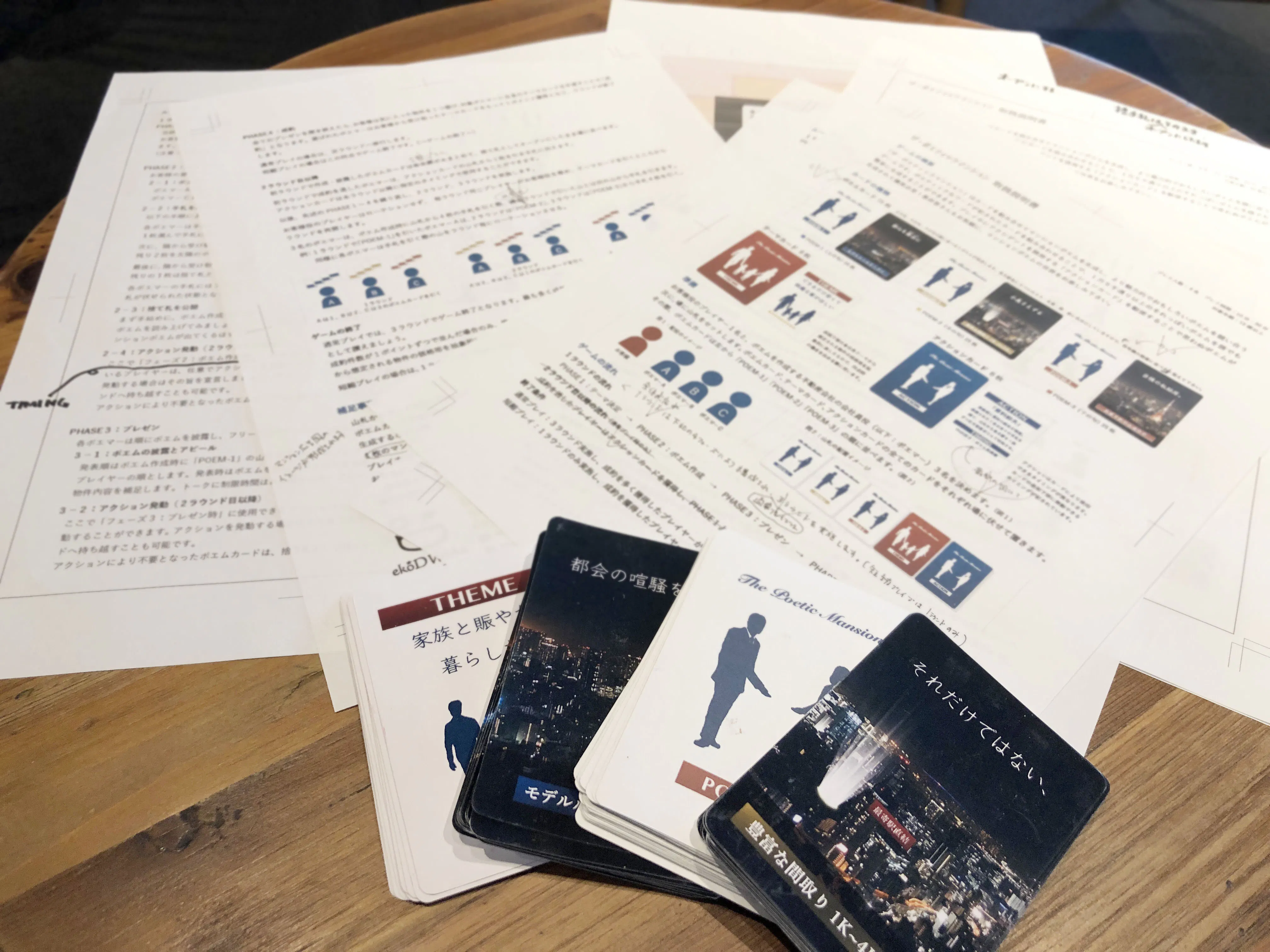 スムーズ且つ盛り上がるための進行手順、「テーマカード」「アクションカード」といったゲームデザインの要となるアイディアなど、協力者の面々と議論を重ねて改良し、徐々に完成形が見えてきました!
