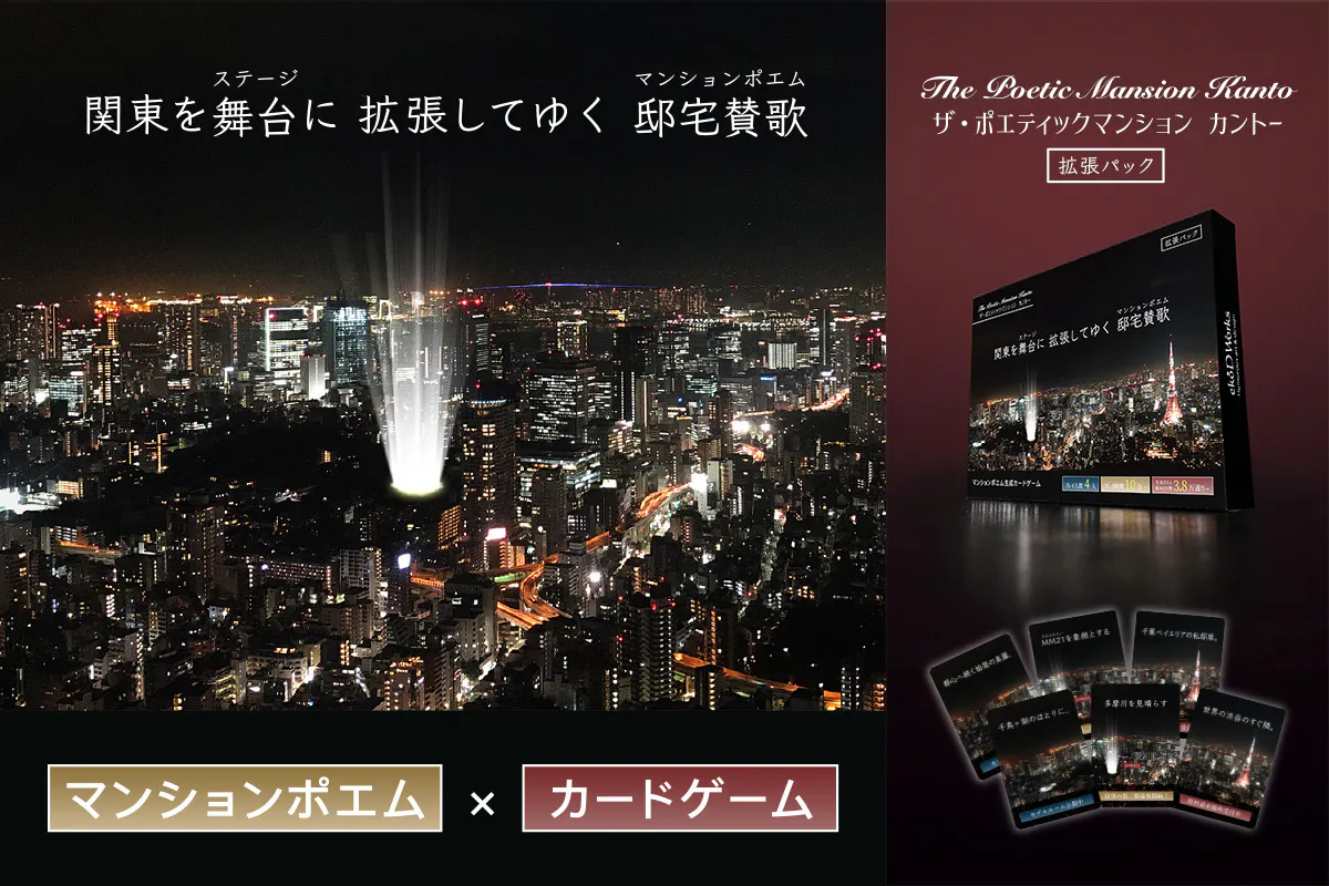 2020/03/31 12:04こんにちは、エコードワークスの福澤です。皆様、ザ・ポエティックマンションはお楽しみいただけていますでしょうか。お陰様で昨秋のクラウドファンディング後もご好評をいただきまして、初回生産分は年内に完売し、現在は再販分の第二版が入荷したところであります。そしてこの度の再販に合わせて、新たに拡張パックを導入いたしました!それが今回ご案内する「 ザ・ポエティックマンション カントー 拡張パック」です。今回の拡張パックは、東京を中心に関東地方の地名を散りばめた36枚の拡張カードを用意しています。従来の「ザ・ポエティックマンション」と組み合わせることで、生成されるポエムに各所の地域性や居住イメージを反映させることができ、より一層おもしろみのあるポエム生成をお楽しみいただけます。例えば…通常版を用いて生成したポエム公園などが隣接した見晴らしの良い丘陵住宅地のイメージでしょうか。上の句を拡張カードに置き換えた例中央区のパワーワードが加わり、高層階から街を見下ろす感じになりました。中の句を拡張カードに置き換えた例川越(埼玉)や佐原(千葉)を彷彿させ、「悠久」の重みも増した気がします。下の句を拡張カードに置き換えた例西東京の広範を示す武蔵野に置き換わり、使い方次第でプレゼン時の汎用性が高まりそう。このように通常版の「ザ・ポエティックマンション」にはない地域性を伴うポエムが生成可能となります。その他事例や詳細情報はnoteにまとめておりますので、是非こちらもご覧ください。note 「ポエティックマンションを関東方面へ拡張する話」https://note.com/fukusawa/n/n64040d80f716本来は4月のゲームマーケット出展に向けた新商品として制作していたのですが、ゲームマーケットの中止に伴いましてオンラインストアでの通常販売をスタート致しました。オンラインストアhttps://ekodworkstore.com/items/5e1e9ac868d163504f8f0e29巣ごもり生活が推奨されるご時世ではありますが、是非この機会にカントー拡張パックをご活用いただき、益々拡がるポエティックマンションの世界をどうぞお楽しみ下さい! もっと見る