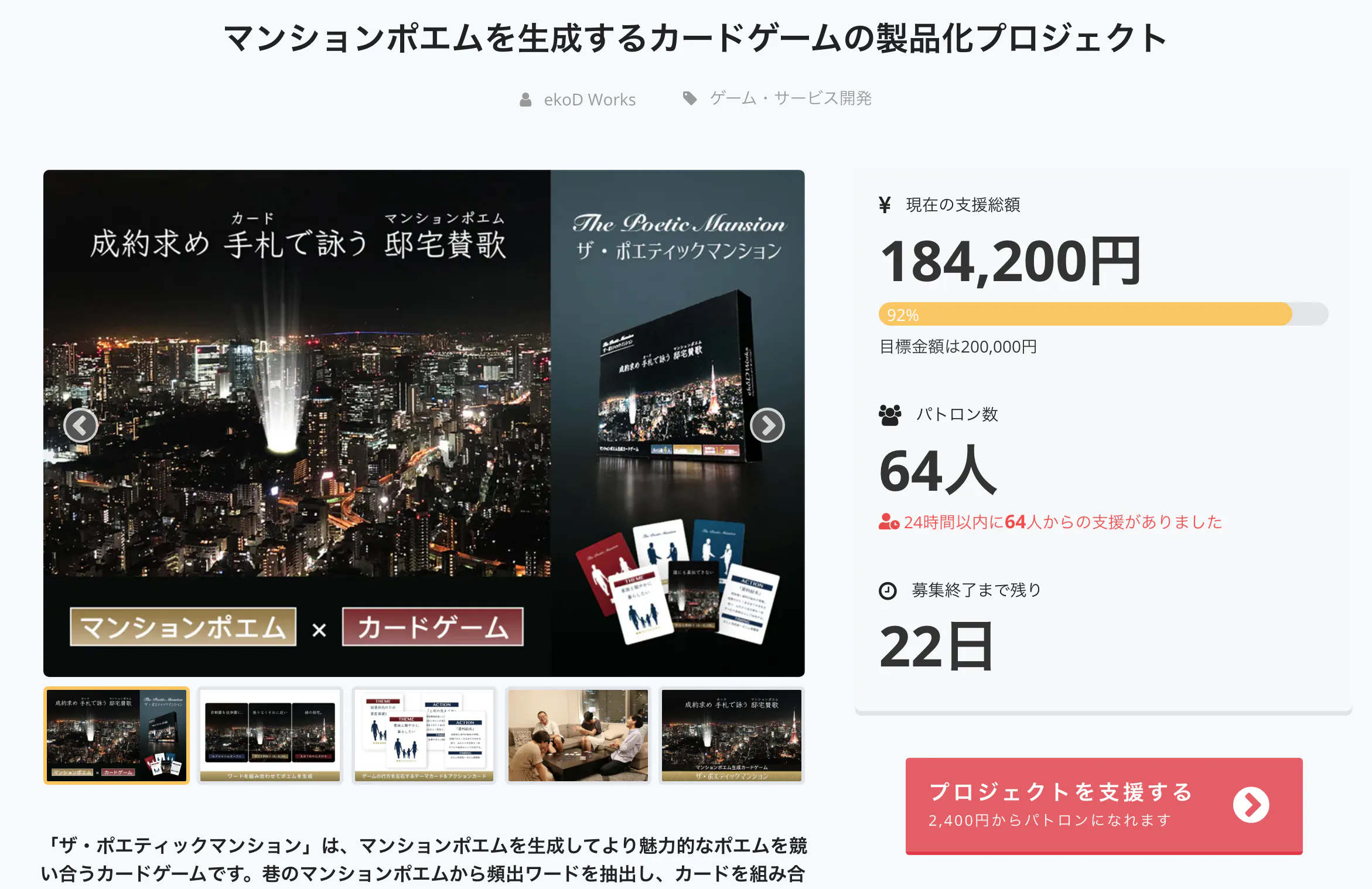 幸いにも現時点で既に目標比90%以上のご支援を頂いており、この分であればプロジェクトを滞りなく進行できそうなので胸をなでおろしております。(苦笑)