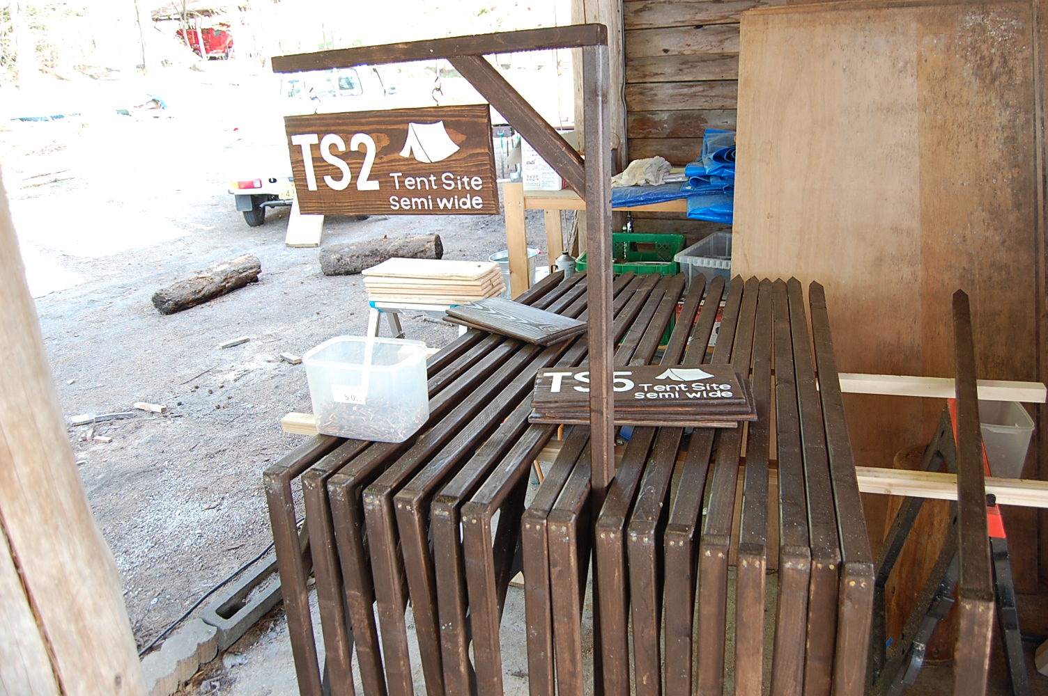 サイト看板が全部できあがりましたもう少し太い木を使いたかったのですが・・・予算の都合上で・・・
