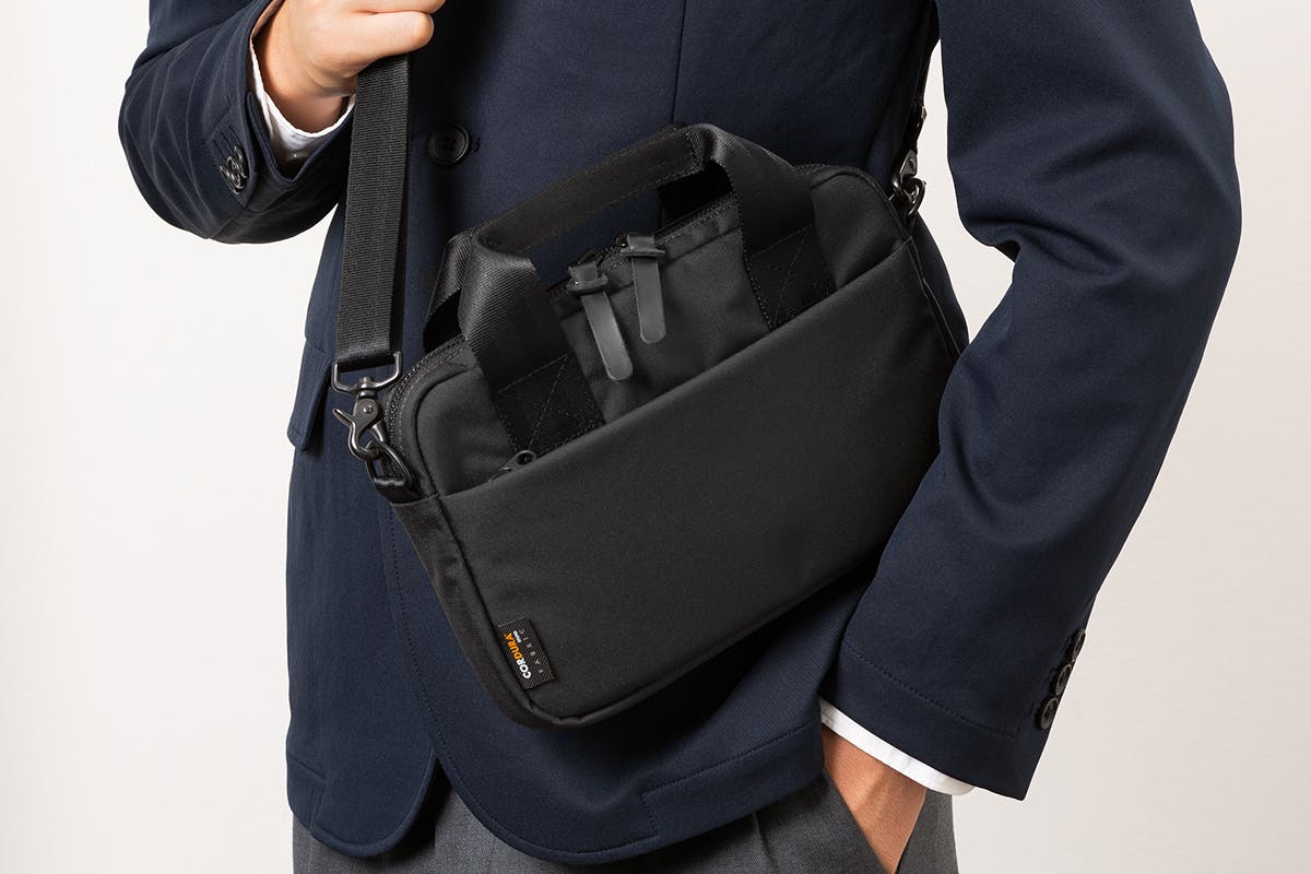 ショルダーストラップ付属のため、晴れの日は手持ちスタイルで、雨の日はショルダースタイルで、などシーンによって使い分けが可能です。日々の通勤シーンでの使用を想定しているため、フォーマルやカジュアル、すべてのスーツに合うデザインです。