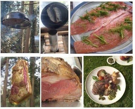 窯煙を利用した冷燻(写真は桜鱒とポーク)
