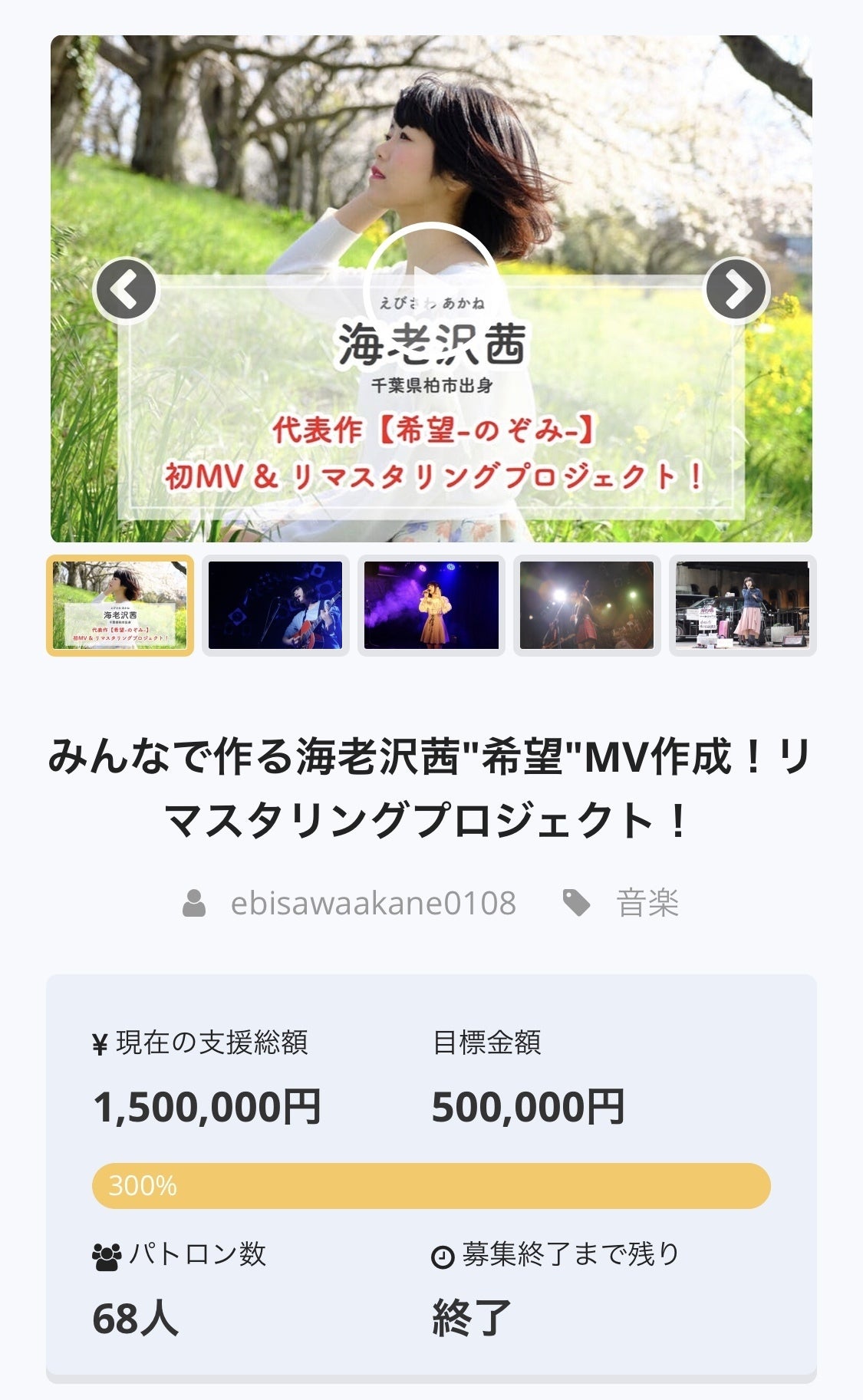 2019/10/23 17:11こんばんねっちヽ(`・ω・´)ノ海老沢茜です!こちらでのお礼が遅れてしまい申し訳ございません。先日の10月15日に無事"希望"リマスタリング&MV制作の初クラウドファンディングが無事に終了いたしました!そして300%で終えることができて本当に本当にびっくりしました。嬉しかったです。応援してくださった皆様。拡散してくださった皆様。そしてご支援してくださった皆様。本当に本当にありがとうございます。自分の言葉や行動でこの先どんなことが出来るかわからないけれど自分が音楽に助けられた分。今度は自分が人を救える存在になりたいです。その為に今日も歌います。日々沢山の幸せをありがとう。あなた方の応援が私をもっともっと強くしてくれるし輝く場所かできてます。本当にありがとう。リターンは12月から順次お届け予定です!CD共々お届けをどうぞお楽しみに! もっと見る