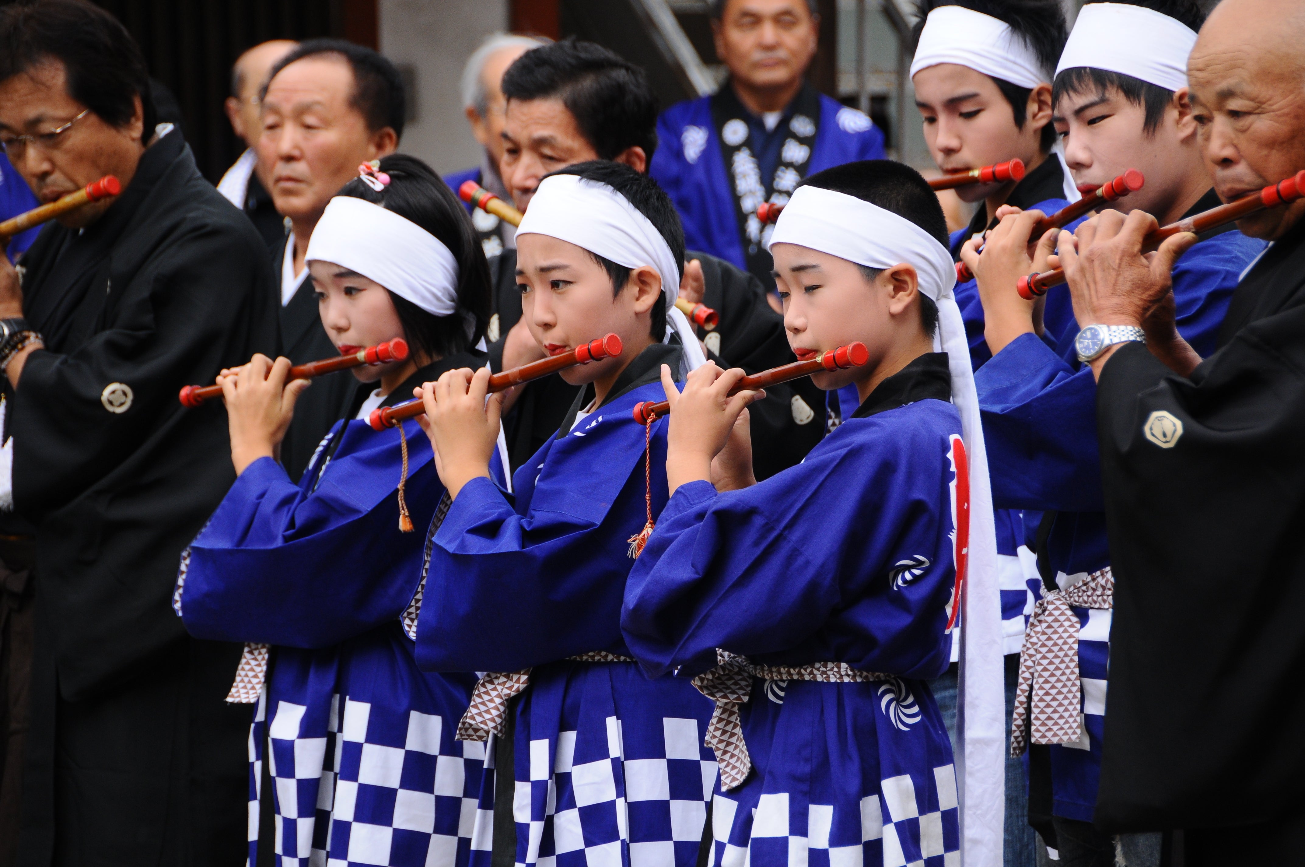 ↑ 写真上から、巡幸区の女性たちによる道楽、子供と老人による笛拍子、ジャンガラと呼ばれる独特の衣装と鳴り物。このようにお法使祭は老若男女が総出で祝う重要なお祭り。