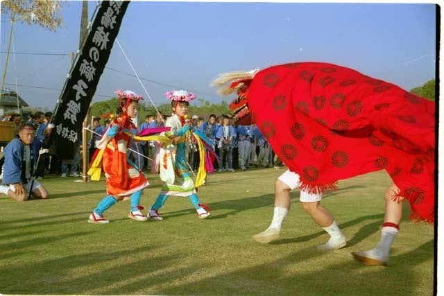 ↑ 獅子舞と巫女の舞。伝統衣装は特殊なつくりなので購入には経費が必要です。