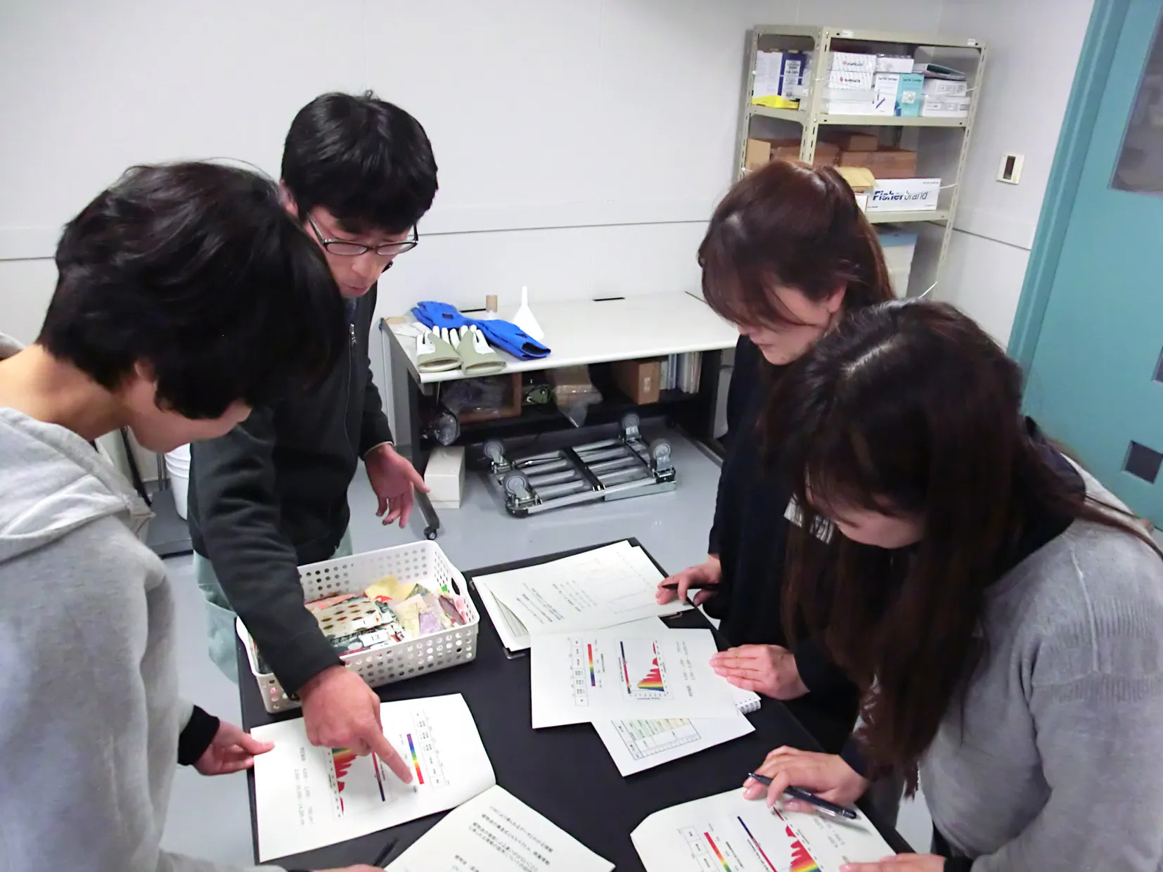 宮城県産業技術総合センターの設備を活用させていただき、指導を受けながらはじめて顕微鏡による拡大観察と赤外分光分析測定を行いました。