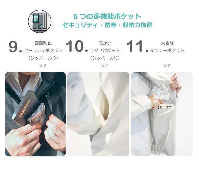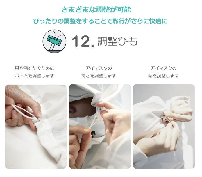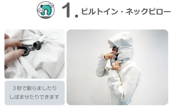内蔵されたネックピローとアイマスク、手袋、暖かいポケットなどで快適な休息空間がジャケット内で調整できるので、どこでも快適に休むことができます。