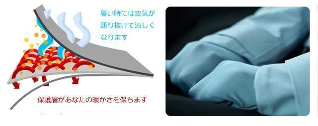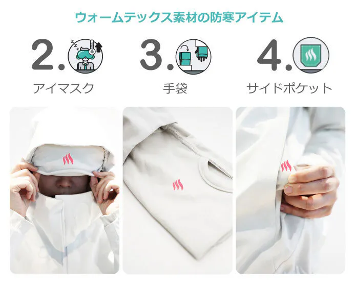 アイマスク、袖の手袋、サイドポケットにもウォームテックスが使われており心地よい暖かさを保ち疲れを癒してくれます。