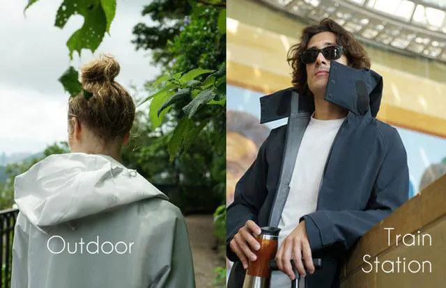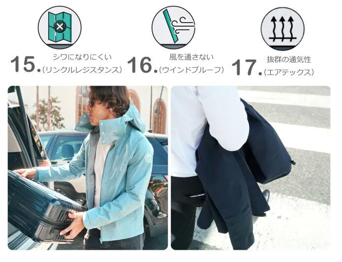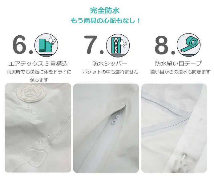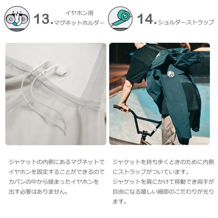 防水素材、防水ジッパー、通気性の高い素材でできているので雨に体やポケットの中のものが濡れてしまうことがありません。そのまま歩くだけなので、もう傘もいりません。