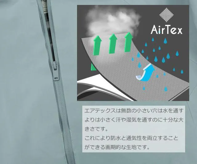 特殊三層構造のエアテックスは1平方インチの中に900万もの小さな穴があり、水を通さず、ジャケット内の湿気と汗は簡単に蒸発し外部に放出されます。この素材により防水と通気性を同時に実現しています。