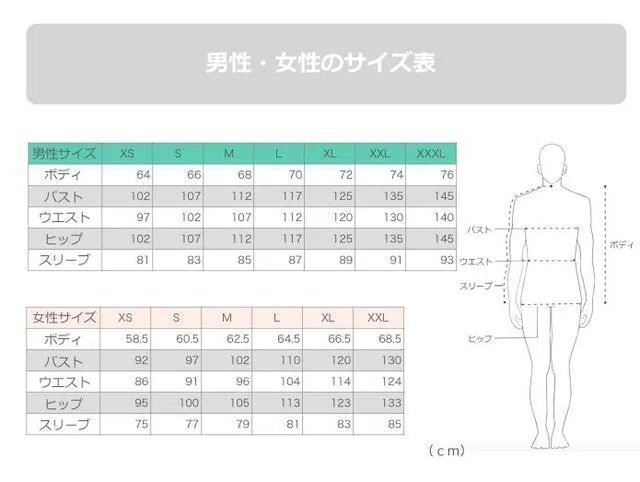 サイズ表をご用意していますので、各部位を測定のうえ一番近いサイズをお選びください。
