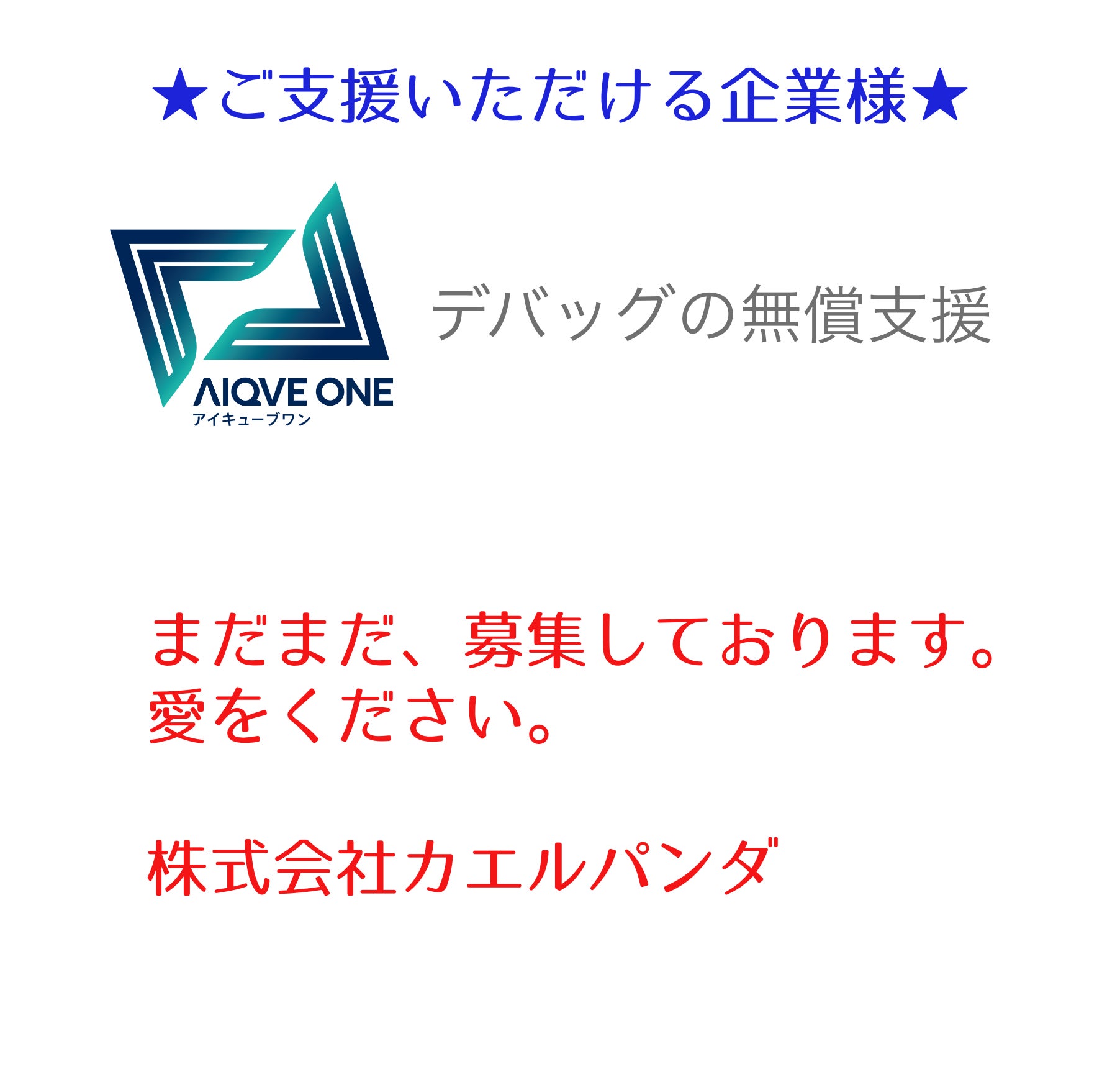 AIQVE ONE 株式会社(アイキューブワン)さんより、「デバッグの無償支援」でご支援いただけることになりました。
