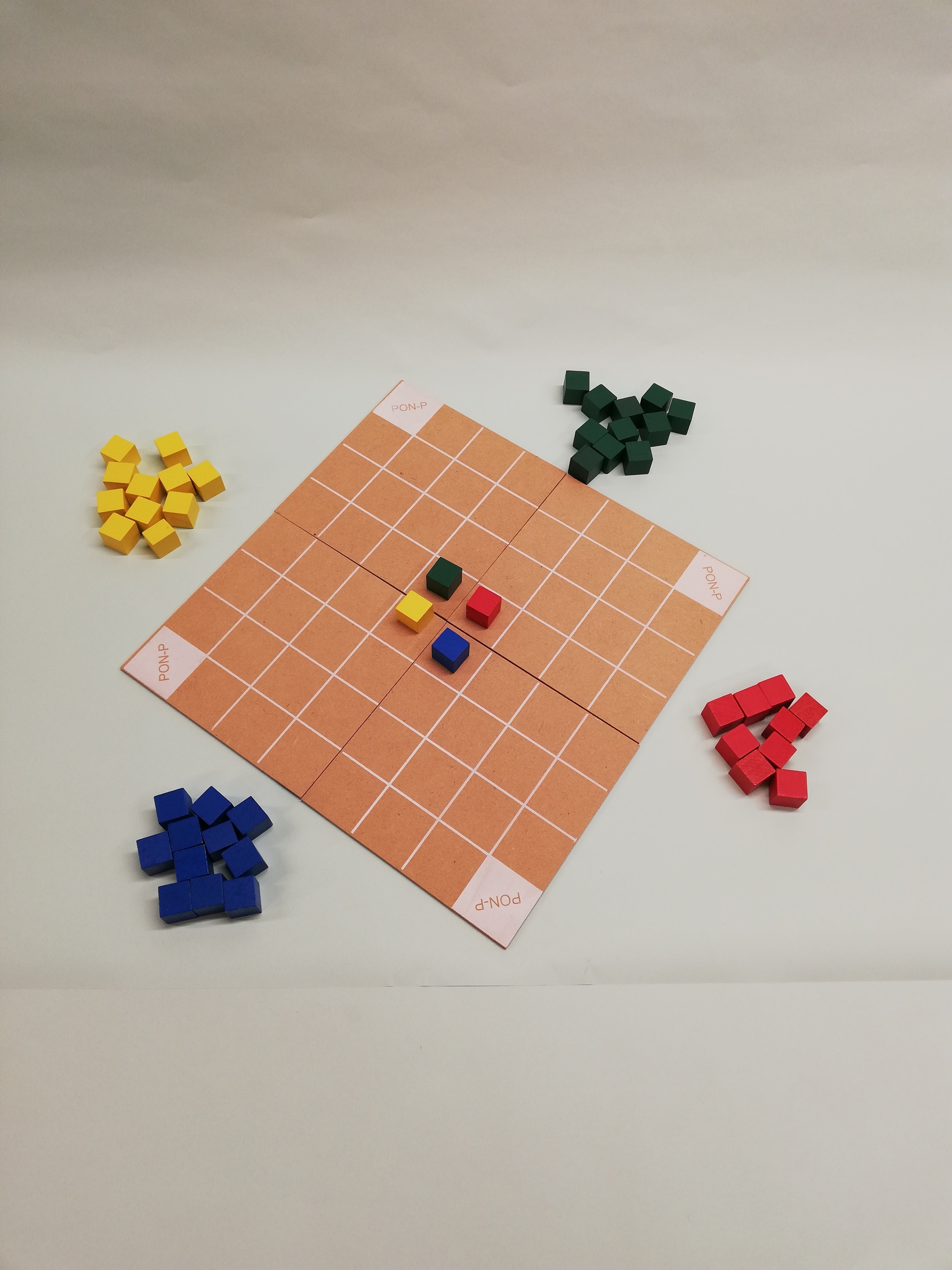 『PON-P(ポンピー)』は木のコマを使ったボードゲームで「五目並べ × 挟み将棋 × オセロⓇ」 のような、小学校低学年のお子さんからでもすぐに遊べる知育ボードゲームです。