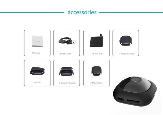 【どこでもアクションカメラ】には、「マグネット」「クリップ」「吸盤」「粘着シール」の4つのアクセサリーがあり、すべてがセットになったリターンも選ぶことが可能です。