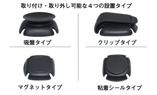 【どこでもアクションカメラ】には、「マグネット」「クリップ」「吸盤」「粘着シール」の4つのアクセサリーがあり、すべてがセットになったリターンも選ぶことが可能です。