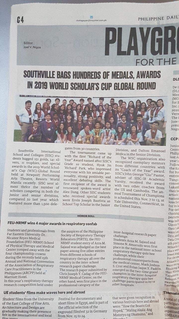 リゾートワールドマニラ、ニューポートシティにて開催された、ワールドスカラズカップ グローバルラウンド2019に於いてサウスビルインターナショナルスクール(以下SISC)の生徒は151個の金メダル、141個の銀メダル、11個のトロフィーと、特別賞を獲得しました。