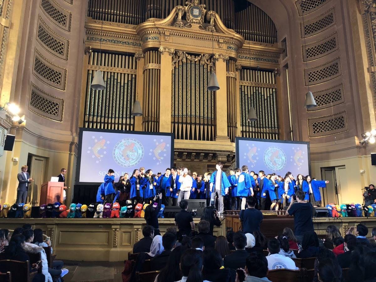 私はフィリピン団での参加をいたしましたが、会場には日本人の高校生も全国各地から勝ち進み、参加していました。最終日の大舞台で、彼らと共に発表をし、『ソーラン節』を踊りました。最前列の白い服です。日本からのお揃いの法被は着ていませんが、日本とフィリピンの代表精神をイェール大学という国際舞台で体現しています。