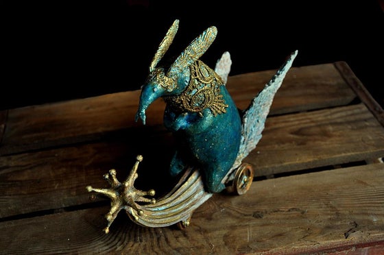植田明志の作品世界において"アイデンティティ”の 象徴であるマスコット的なキャラクター「テイテイ」。 現在に至るまで様々な「テイテイ」たちが登場してきました。 今回のクラウドファンディングのリターン用作品でも登場している 「テイテイ」の歴史を振り返ってみたいと思います。 テイテイが初めてその姿を現した平面作品「灰色の街のテイテイ図」。 全てのテイテイたちの元となった作品です。 古い挿絵のようなタッチで描かれたテイテイと、不思議な生き物のような乗り物。 象形文字を想わせる、植田明志の創作文字「街文字」が書かれ、 フレームの上部にはレリーフ状に処理された2匹のテイテイたちも造形されています。 テイテイが立体で初めて登場した記念すべき作品「トロイメライの車」。 地面に足が着くと死んでしまうテイテイたち。 自身で歩く事が出来ないテイテイたちは必ず乗り物に乗っています。 石粉粘土をベースに、真鍮線や木材などの異素材を初めて取り入れた ターニングポイントとなる作品です。 2014年開催の個展「遠すぎるパレード」で登場した「流れ星に乗って」。 流星のような乗り物に乗って、白い星の白い大地で行われる パレードの先頭を進むテイテイです。 両手を交差した祈りのポーズに、宇宙を想わせる青い身体。 レースのような首飾りといったテイテイの特徴が確立してきています。 三角や丸、四角の積み木の車に乗った小さなテイテイたち「テイテイトレイン」。 テイテイのシルエットもスタンダードな形から発展して 個性的な姿のテイテイたちが派生してきています。 「テイテイマシン猛レース」と題されたシリーズ。 腕自慢のテイテイたちが、各々、自慢のマシンでレースに参加します。 テイテイの先祖の姿が造形された「ご先祖テイテイ」たち。 身体が土器を想わせる殻で覆われており 殻の部分はテラコッタ粘土が用いられています。 現代のテイテイとは異なり、古代のテイテイたちは自身の足で大地に立っているのも 特筆すべき点です。 今回のリターンでは、テイテイの立体作品をセミオーダー形式でお作り致します。 耳の大きさや形」と「服の色」をご指定頂き(※色はベースカラーを選んでいただけます) そのご要望を基に、作家が細部を調整してテイテイを制作致します。 是非、世界にひとつだけのテイテイをお迎えして下さいね。