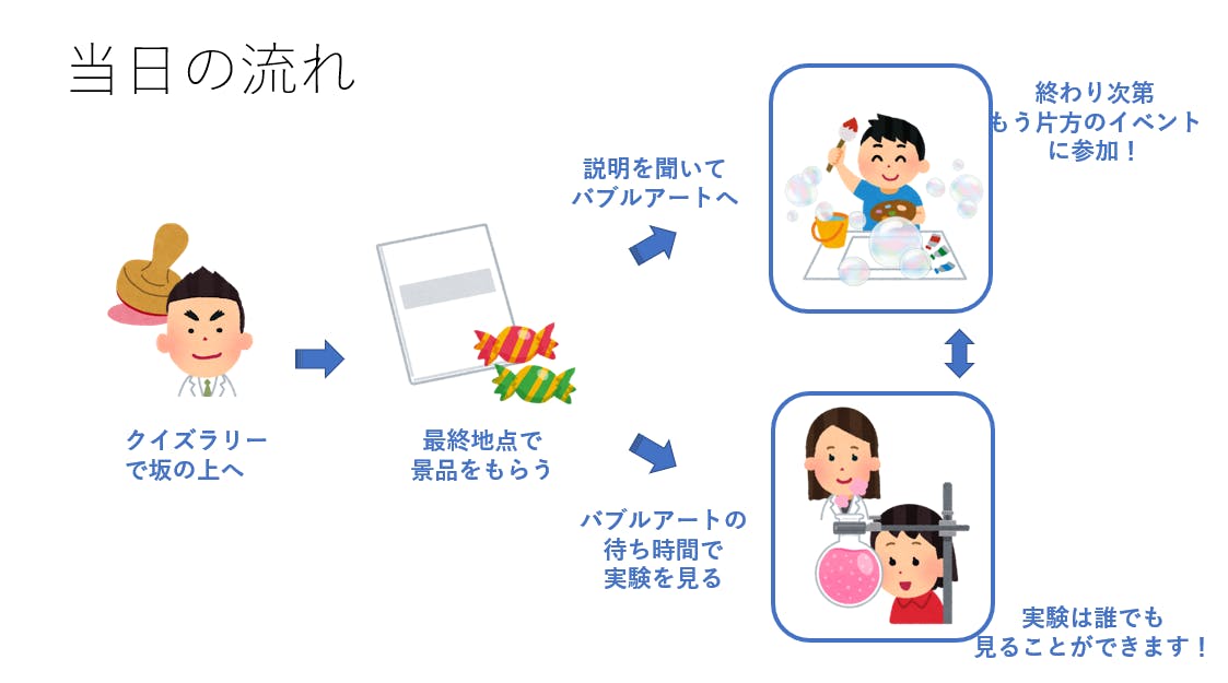 私たちはクイズラリー、バブルアート体験、シャボン玉実験を通し、子供たちに科学、芸術をさらに興味をもって楽しんでもらい、坂にお絵かきのイベントをさらに盛り上げていきたいと思ってます!