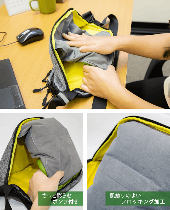 ファスナーを開けていただくとエアーピローが収納されており、ピロー裏側に備え付けられているエアーポンプで簡単に空気を入れていただくことが出来ます。