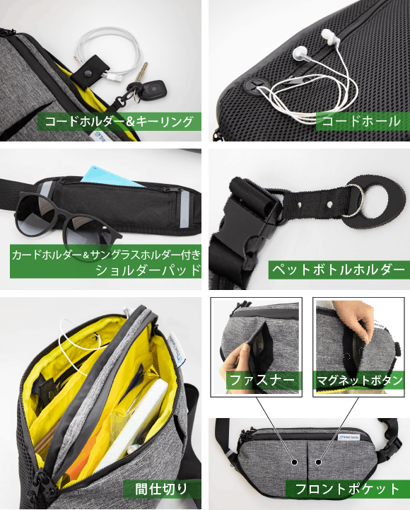ショルダーベルトの長さを調節すればボディバッグだけでなく、ウエストポーチ、 ショルダーバッグとしてもお使いいただけます。