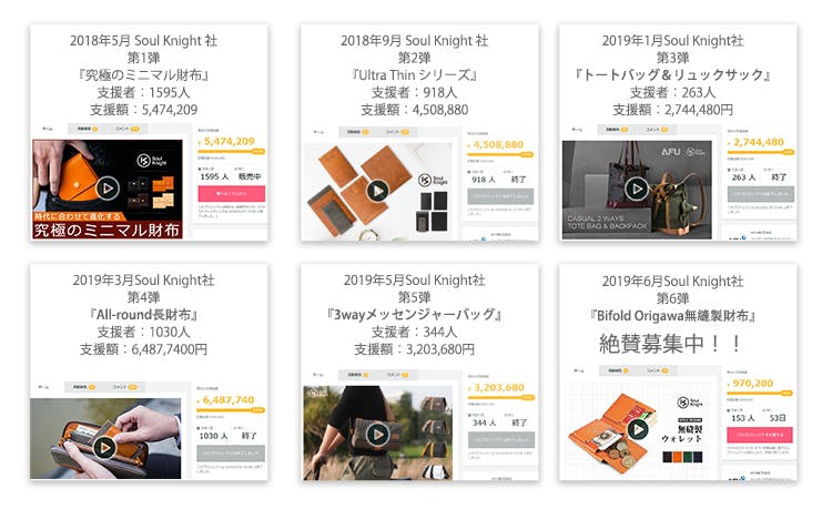 第一弾の【前代未聞!建築学とお財布の融合「Soul Knight」の究極のミニマル財布】、第二弾の【分厚い財布とサヨナラ!ムダを省く、多様なニーズに応えてくれる、Soul Knight社第2弾『UltraThinシリーズ』】、第三弾【トートバッグ&リュックサック、用途に合わせて変形 現代建築学を融合して作られた「SoulKnight社製バッグ」帆布×革で耐久性もデザイン性も兼ね備えたカジュアルバッグ】、第四弾【<帆布&革製>iPhoneまで入る抜群の収納力 現代建築学に基づき設計されたオールラウンド長財布】、第五弾【180°全開可能!Soul Knight社が現代建築学を融合して作った「3wayメッセンジャーバッグ」耐久性のある帆布×本革採用】、第六弾【建築学とお財布の融合、Soul Knight第4弾『Bifold Origawa』無縫製だからコンパクトなのに、収納力バツグン!さらにベジタブルタンニンなめしの革の上質感!】