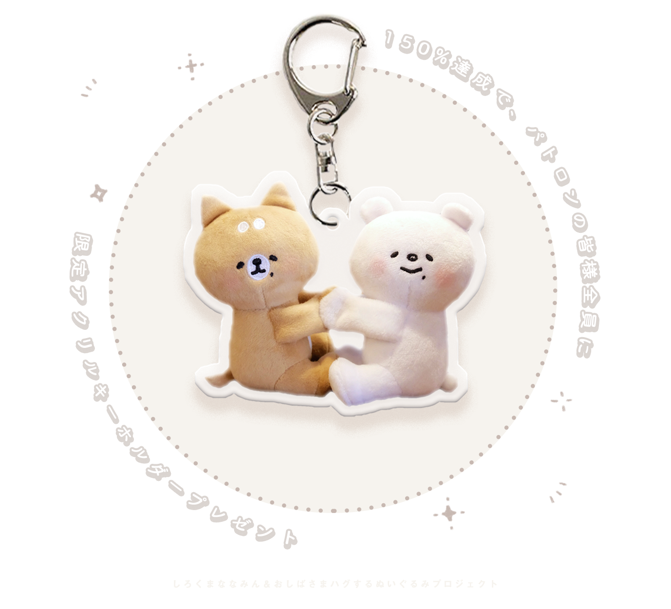 達成度が150%を達成すると【 ご支援いただいた皆さま全員に 】ハグぬいアクリルキーホルダーをプレゼント!このプロジェクト限定デザイン、必見です。