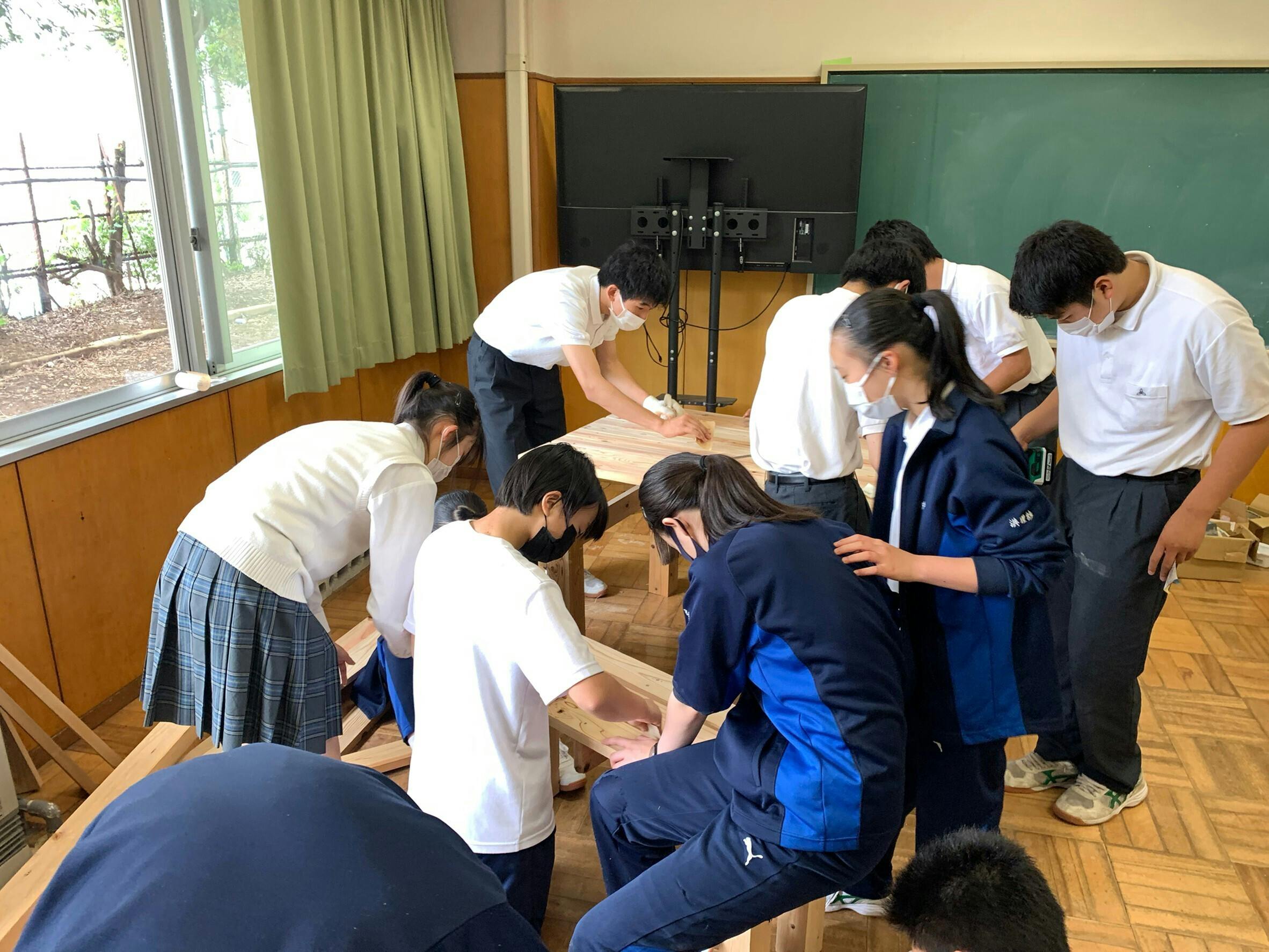 合わせて6つの班に分かれる中、先週はガーデンテーブルとイスが一組組みあがりました。